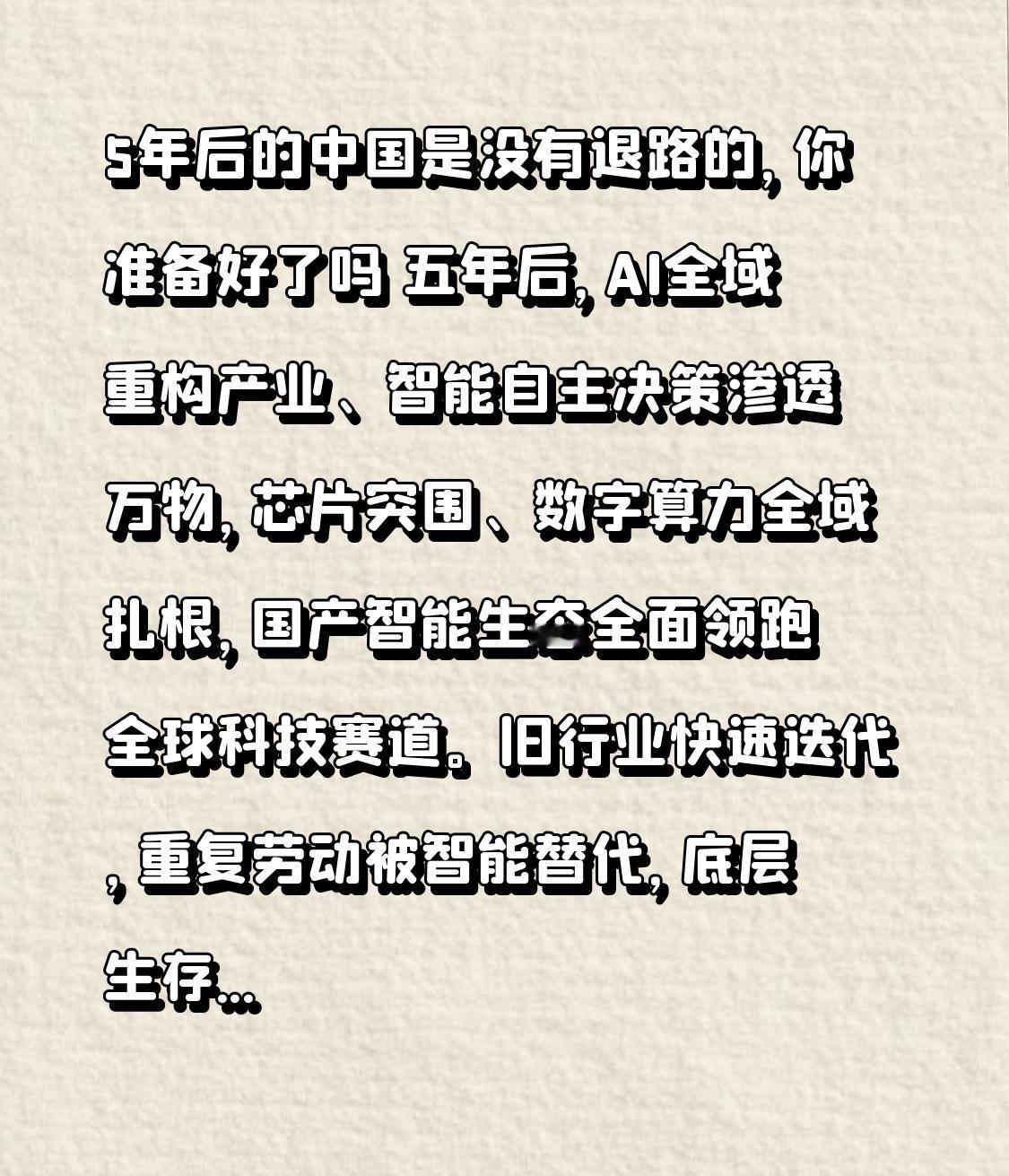 五年后,AI全域重构产业、智能自主决策渗透万物,芯片突围、数字算力全域扎根,国产智能生态全面领跑全球科技赛道。旧行业快速迭代,重复劳动被智能替代,底层生存逻辑彻底改写。