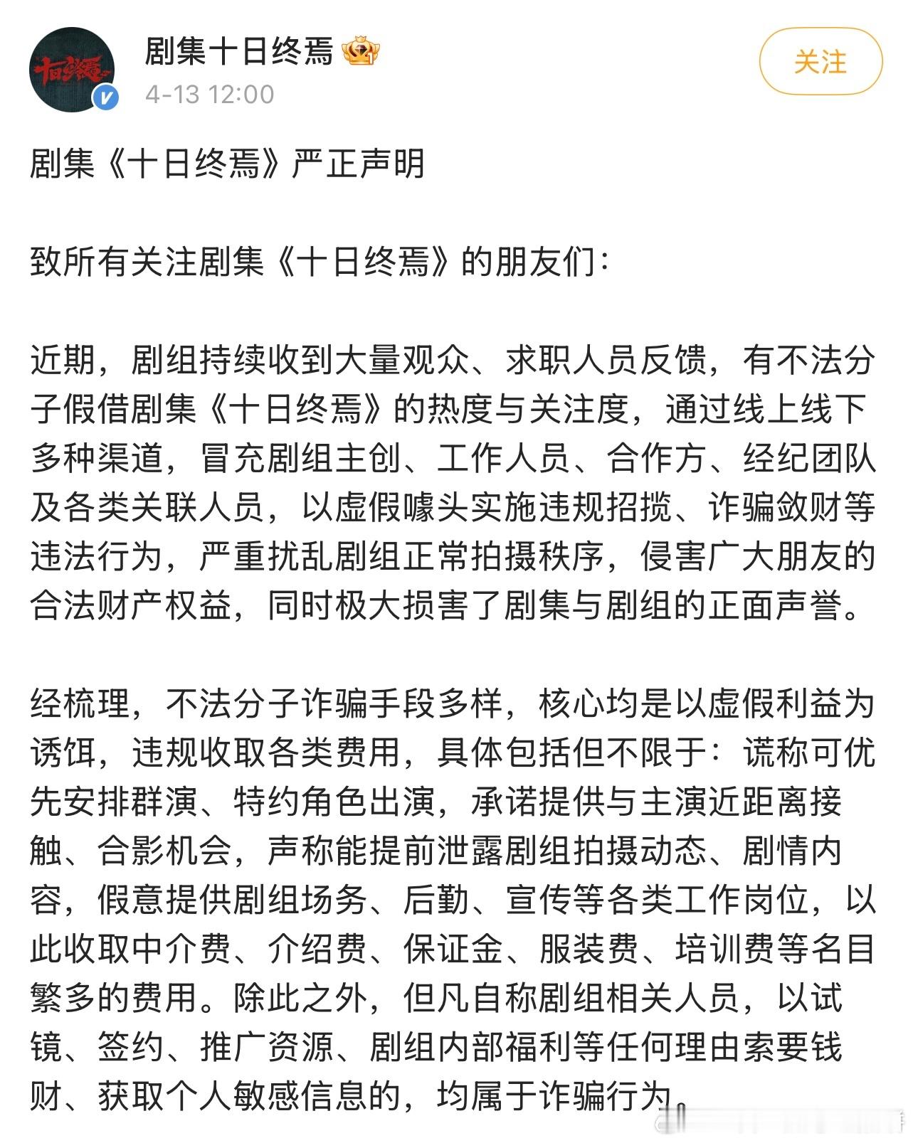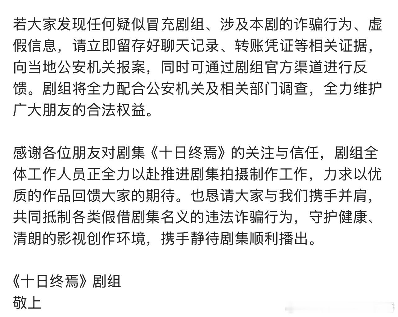 《十日终焉》发布声明,抵制各类假借剧集名义的违法诈骗行为