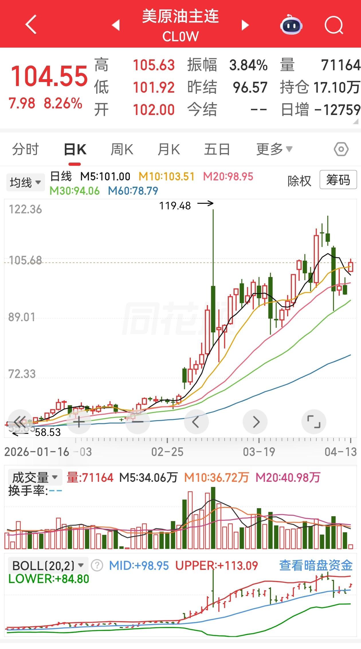简单来说,美国不允许伊朗石油出口,以拖垮伊朗经济。但是伊朗方面也不会坐以待毙,同样会采取反制措施,等于美军和伊朗共同封死了霍尔木兹海峡,那么美国会派军舰到该海峡护航吗?答案是否定的,因为风险太大。所以美国提出的封锁办法难以实施,但受此影响,美油主连一开盘就飚升超过8%,现价为104.55美元/桶,特朗普今晚又会如何安抚股市呢?
