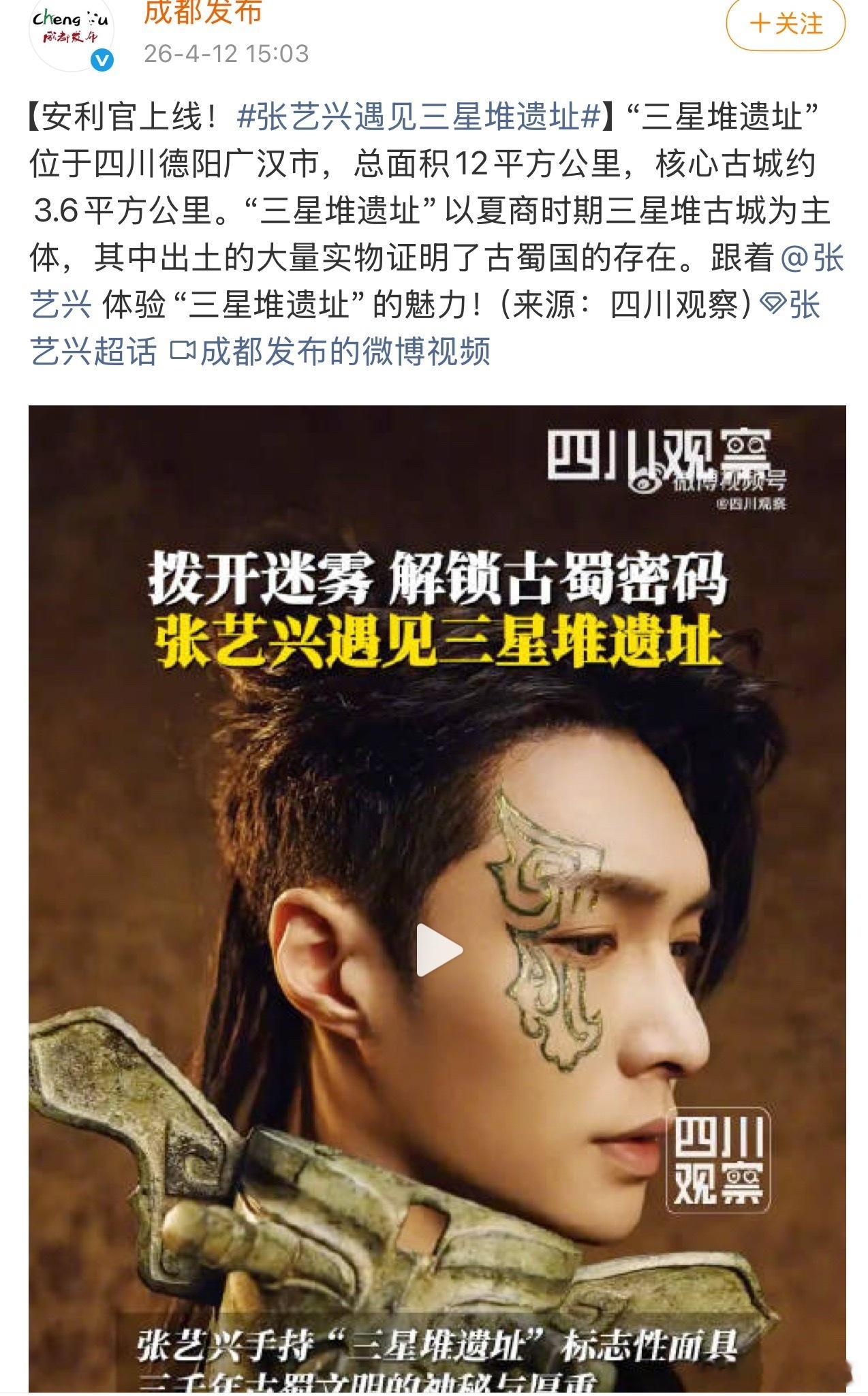 张艺兴就是受各地文旅稀罕,这不四川古蜀国的三星堆遗址也找他宣传了👏