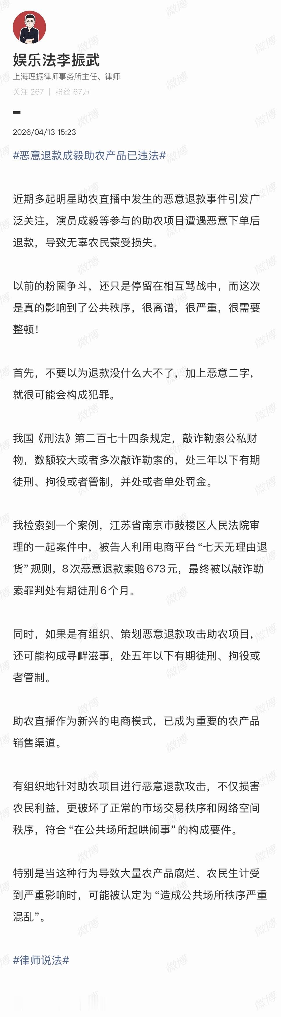 恶意退款成毅助农产品已违法有组织、有谋划影响助农项目,影响公共秩序已突破底线!而