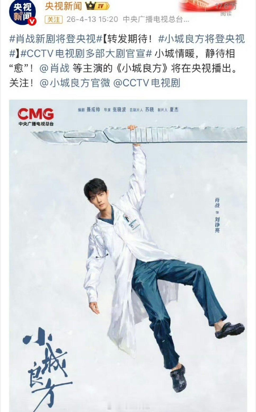 肖战主演的《小城良方》还会直接上星央视呢,真的是得到了官方认可的收视率啊,你期待