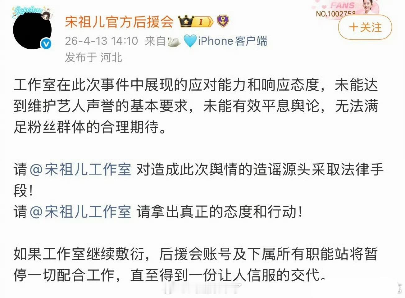 宋祖儿官方后援会认为工作室在此次舆情中没有采取法律手段告黑宣布停运……告谁,告小