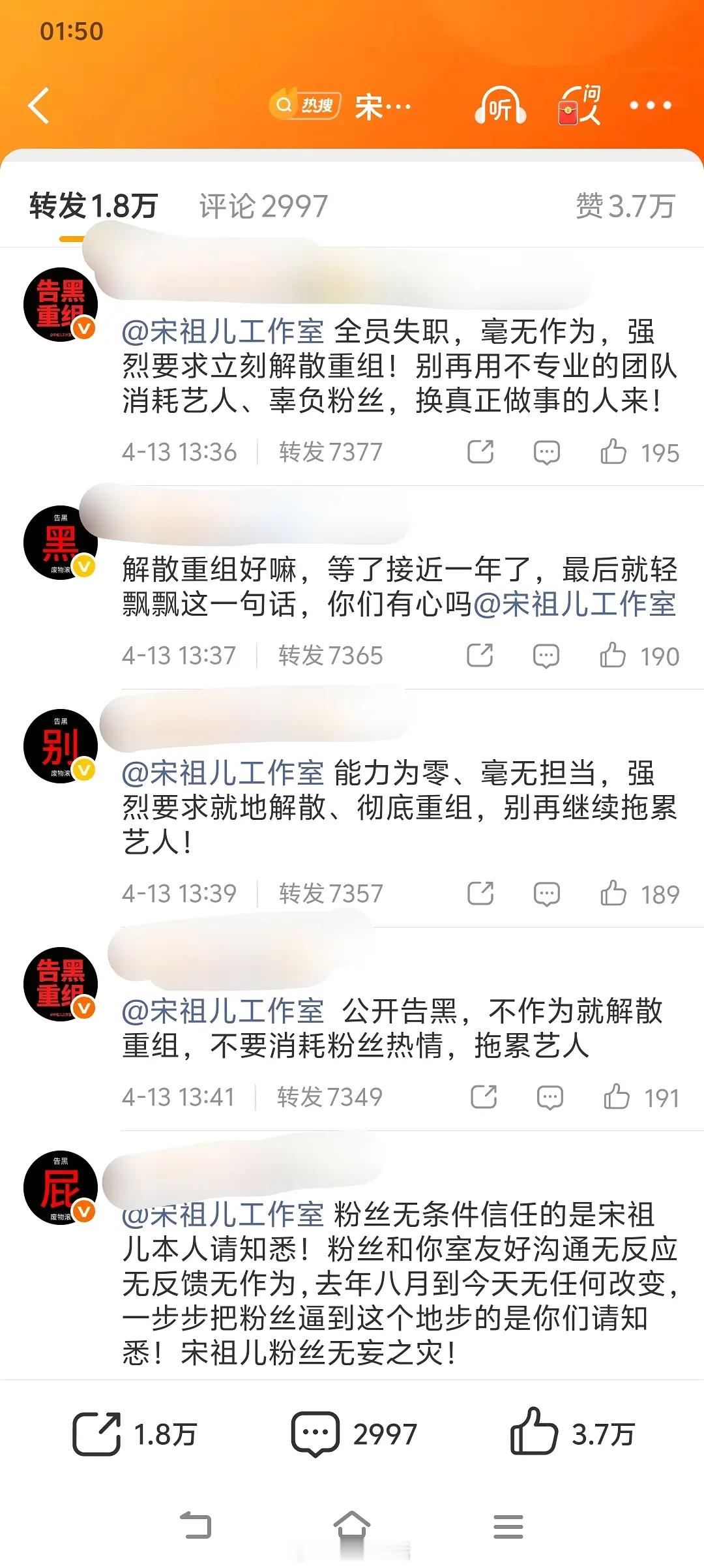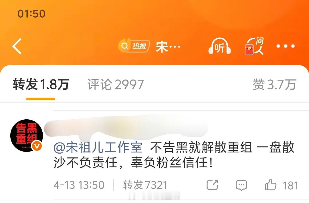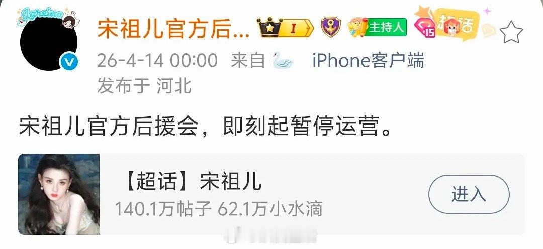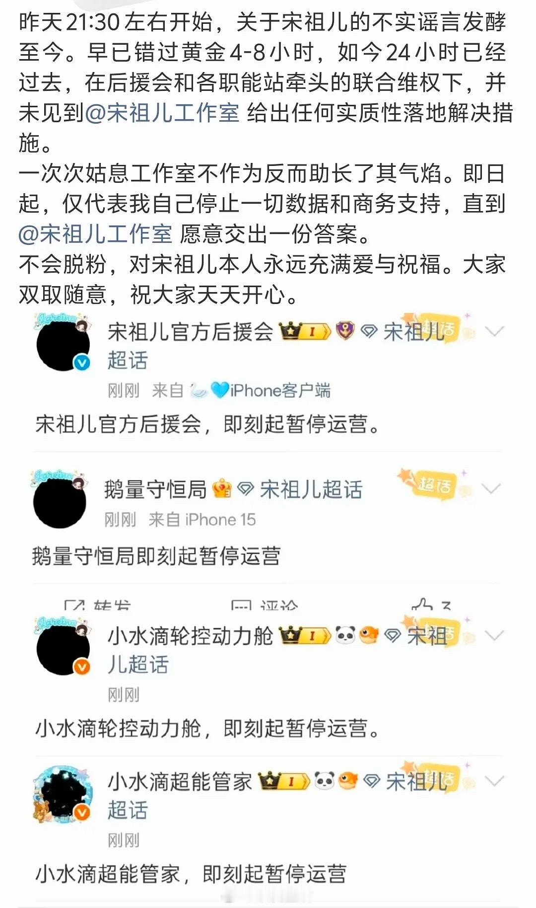 宋祖儿后援会,包括各职能组全部,暂停运营,要求工作室给说法,应该是想要正面回应辟谣小号。