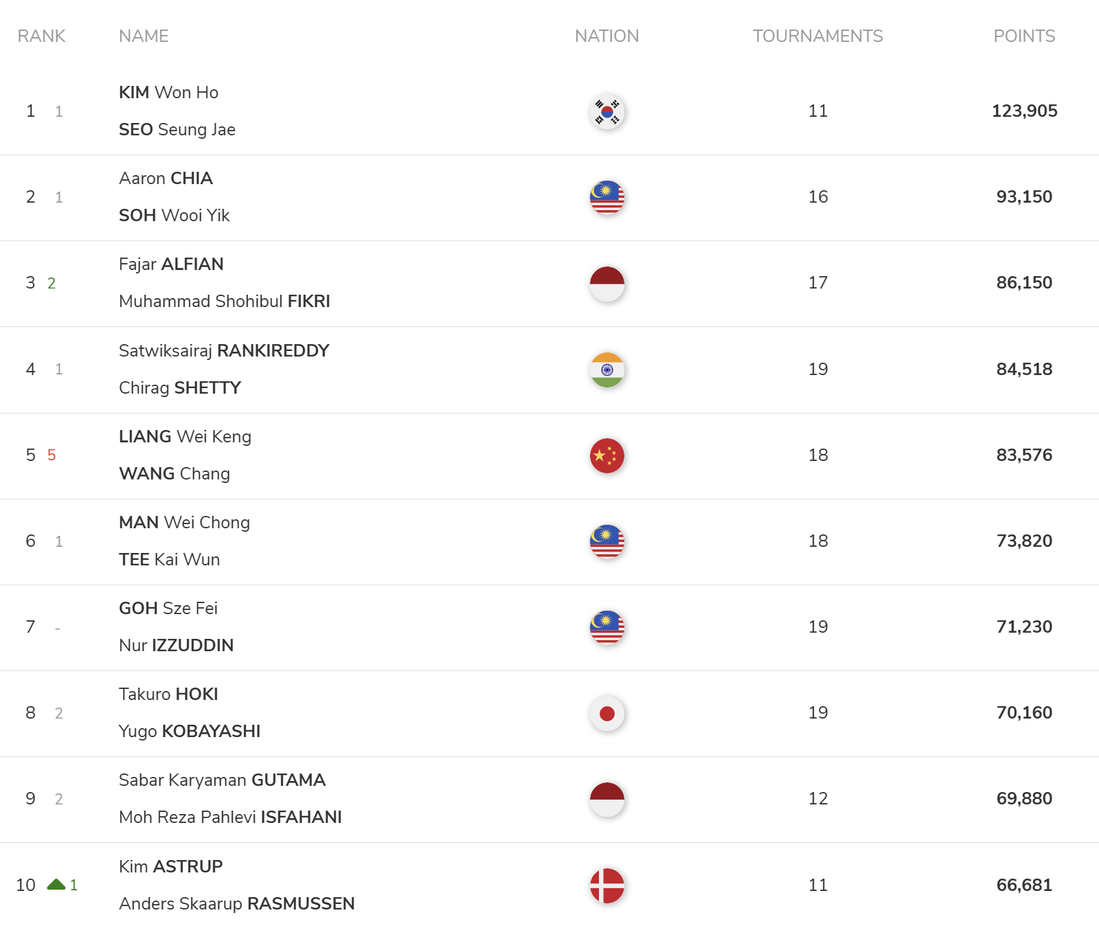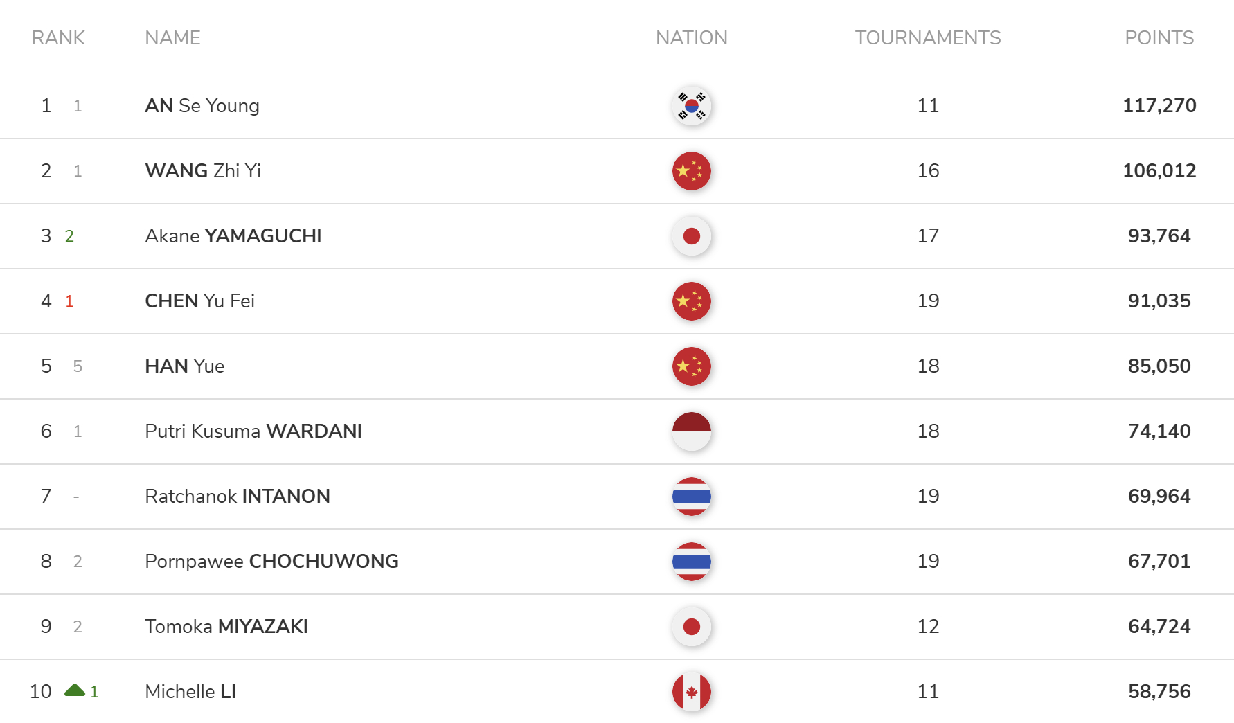 世界羽联2026年第16周世界排名公布,国羽各项世界前十如下: