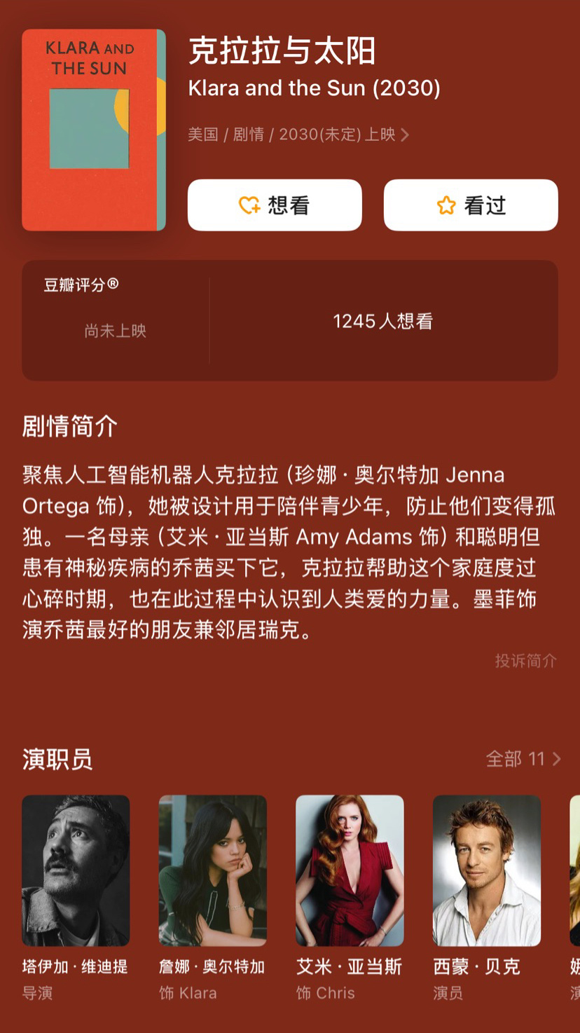塔伊加·维迪提改编的石黑一雄《克拉拉与太阳》北美定档今年10月23日上映,詹娜·奥尔特加、艾米·亚当斯主演。