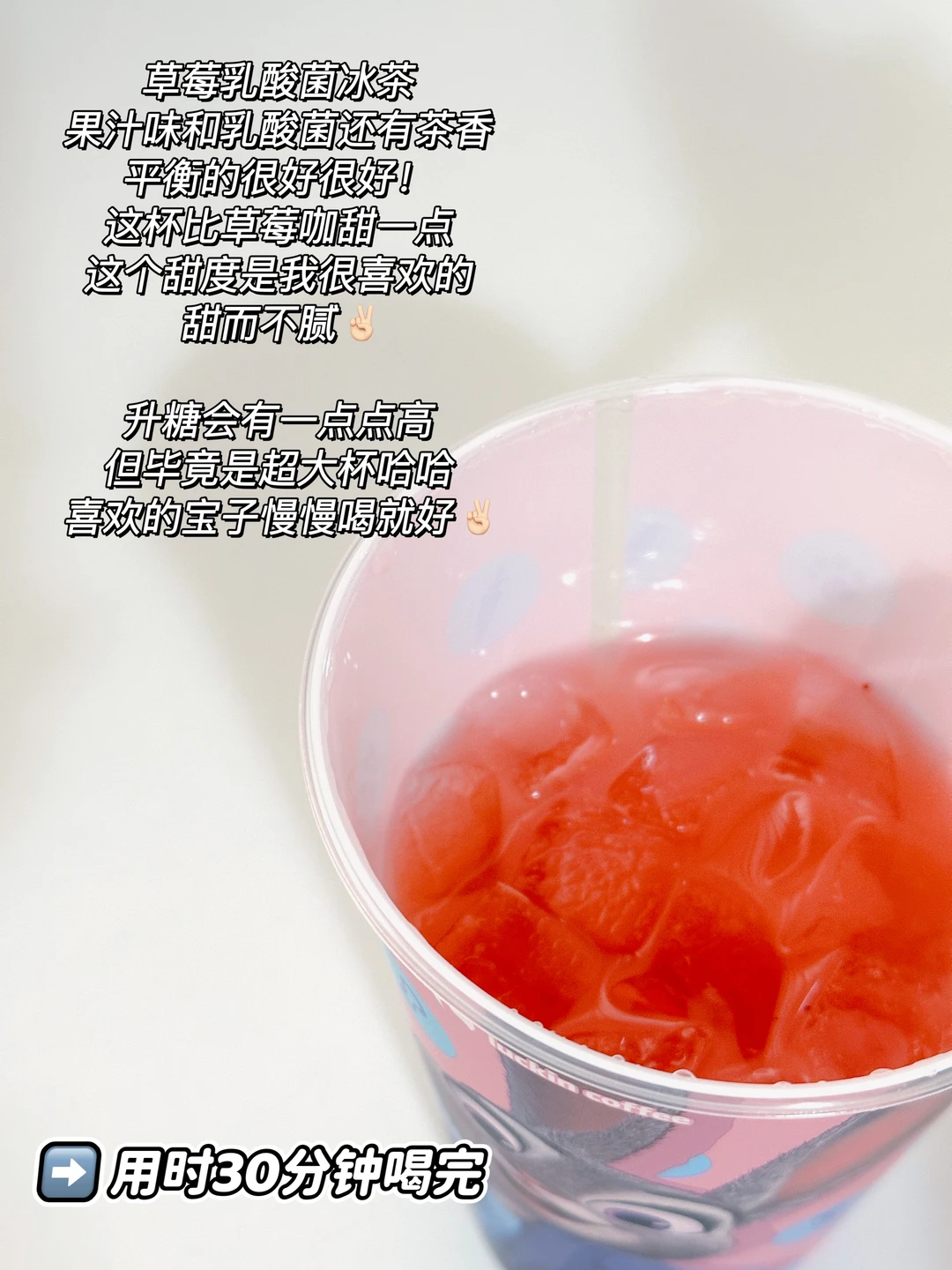 果汁味和乳酸菌还有茶香平衡的很好很好!这杯比草莓咖甜一点,这个甜度是我很喜欢的,甜而不腻✌🏻升糖会有一点点高,但毕竟是超大杯哈哈,喜欢的宝子慢慢喝就好✌🏻