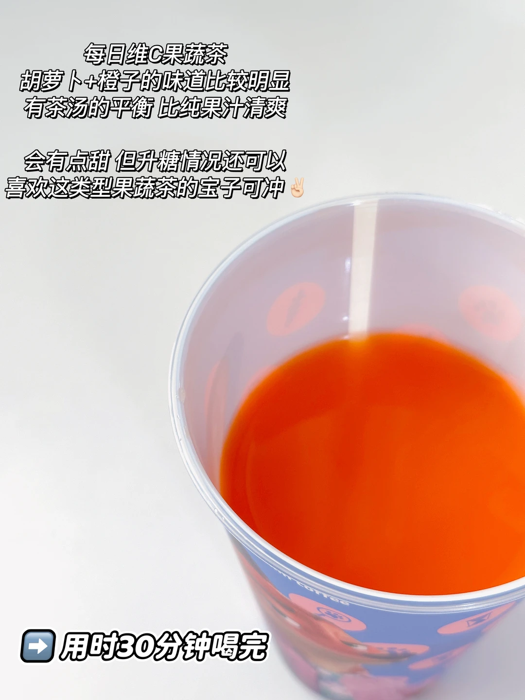 胡萝卜+橙子的味道比较明显,有茶汤的平衡 比纯果汁清爽〰️会有点甜,但升糖情况还可以,喜欢这类型果蔬茶的宝子可冲✌🏻