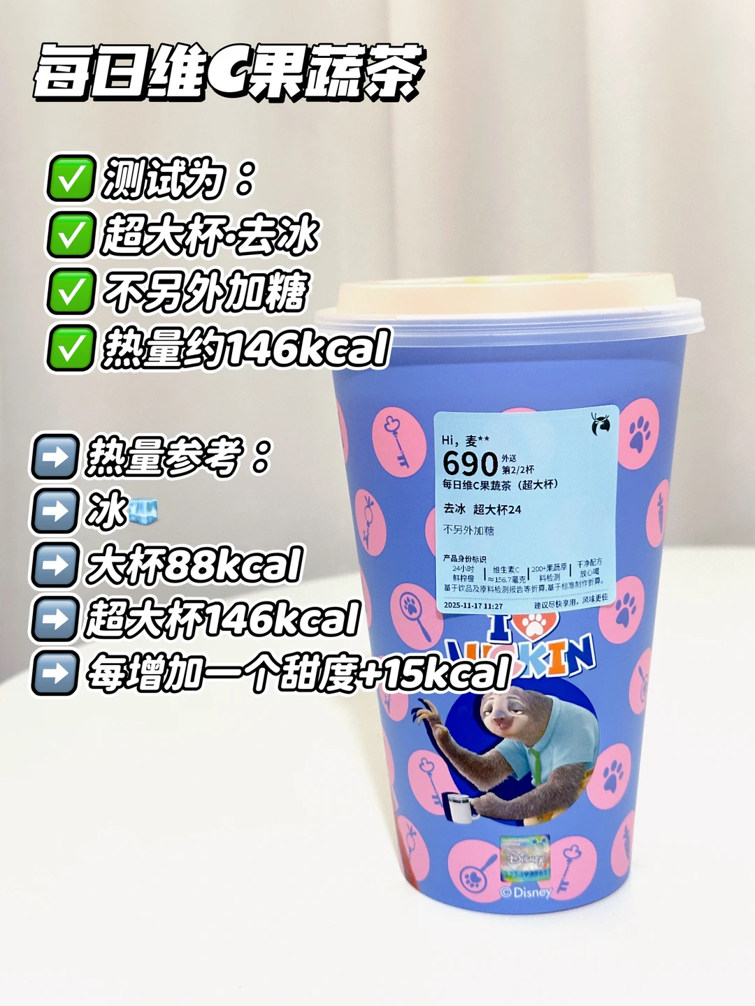 测试为:超大杯·去冰🧊不另外加糖 热量约146kcal 每能加一个甜度热量+15kcal