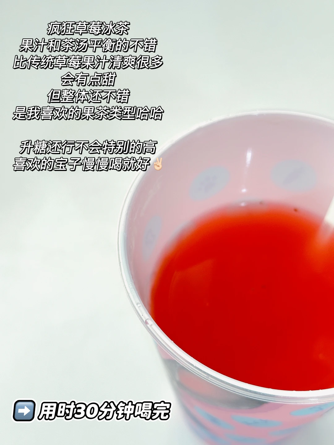 果汁和茶汤平衡的不错,比传统草莓果汁清爽很多,会有点甜,但整体还不错,是我喜欢的果茶类型哈哈〰️升糖还行不会特别的高,喜欢的宝子慢慢喝就好✌🏻