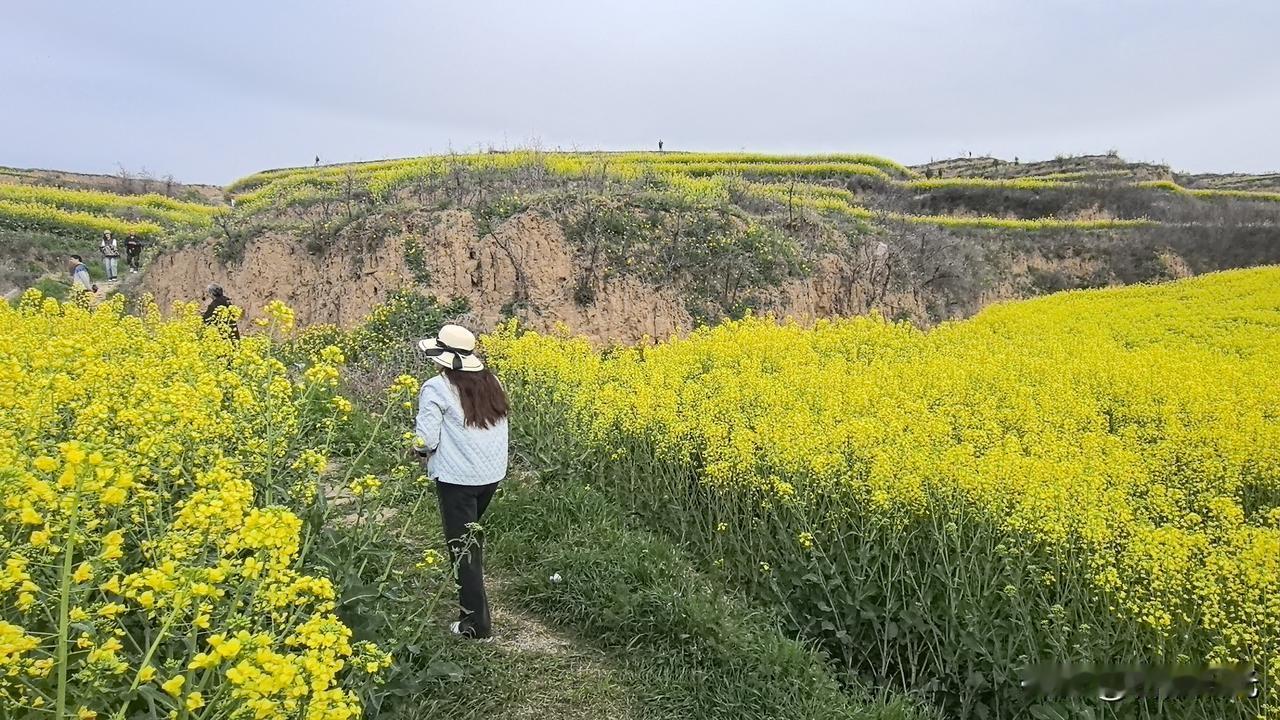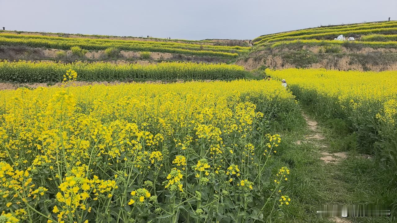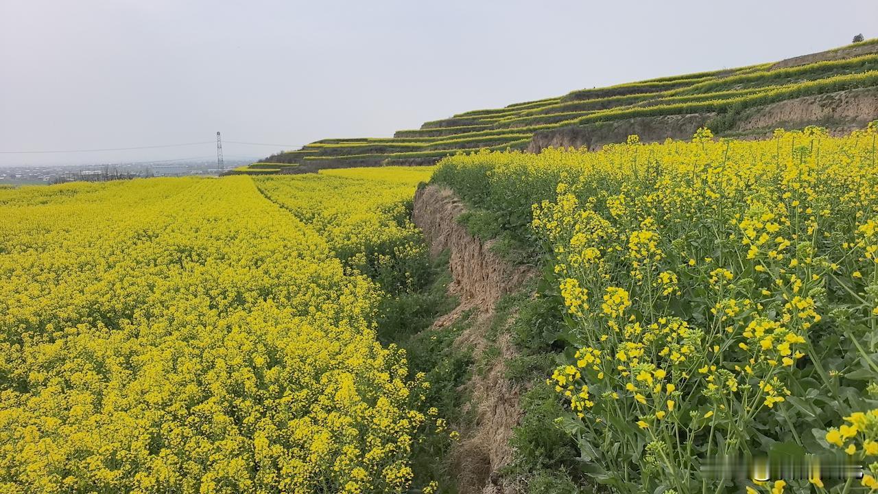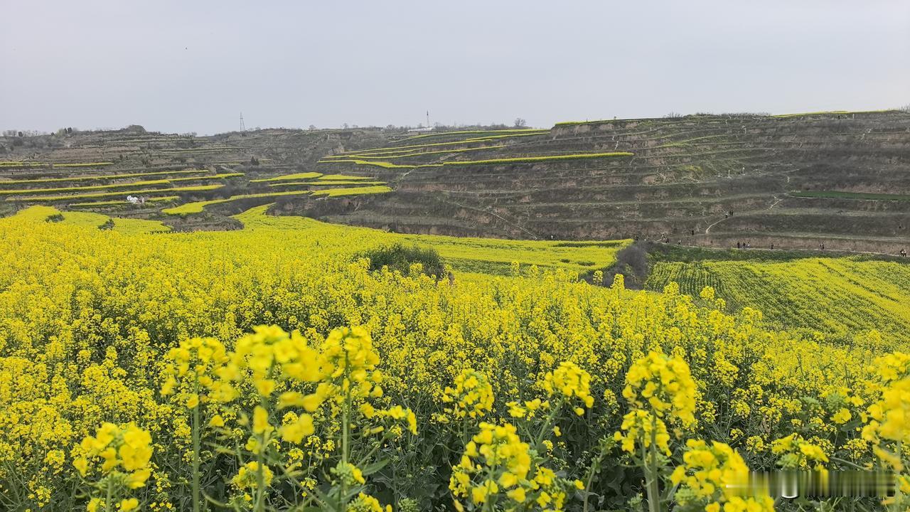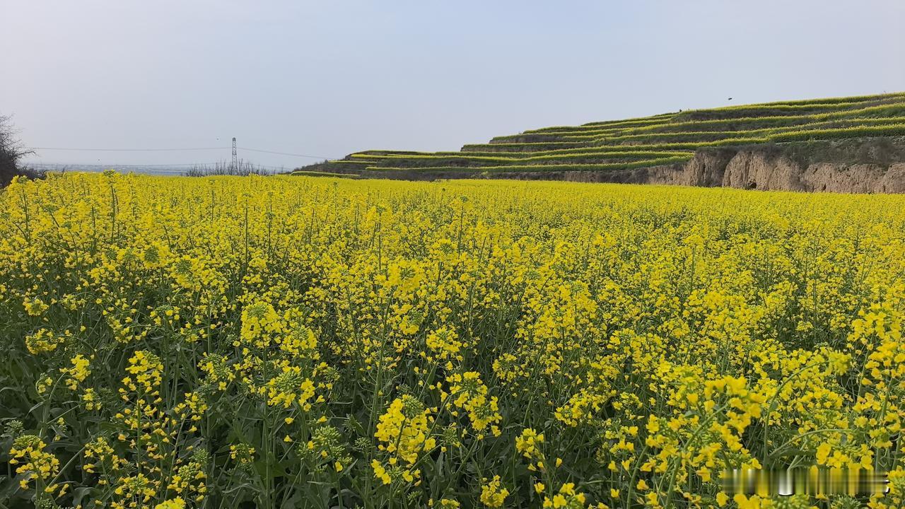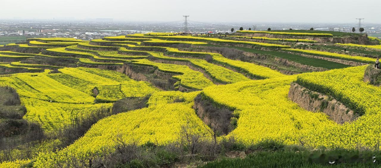 关中平原地区向黄土高原过渡带,在梯田上种植的油菜花,登高望远,层层黄绿色的花海,美景如画。