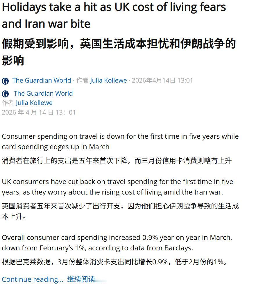 英国旅游消费五年来首降 美伊战争推高英国生活成本