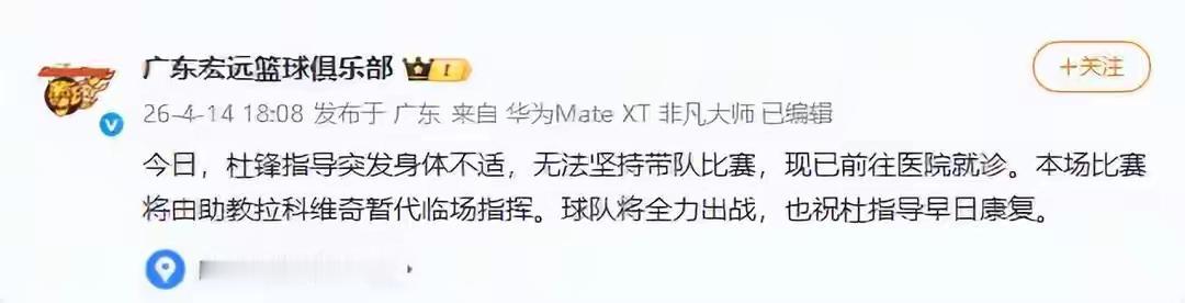 只是这身体原因,是暂时的,还是长期的。会不会是杜指导真的下课了吗?因为大多数下课的教练,都是什么身体原因,不能带队,无法坚持等等的原因下课的呀!广东男篮