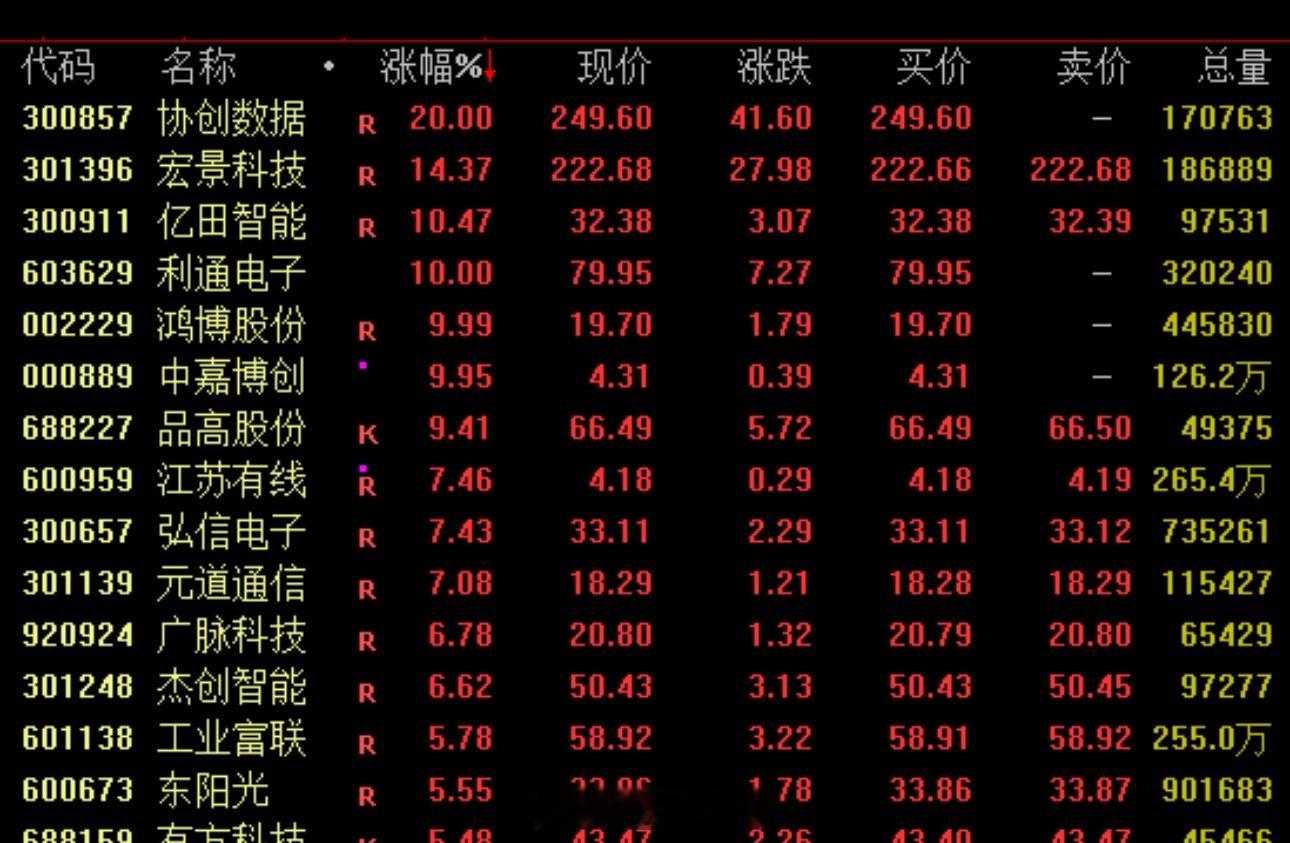 算力概念爆发算力概念盘中强势拉升,截至收盘,协创数据20%涨停,宏景科技涨超14%,盘中涨停续创新高;利通电子、鸿博股份、中嘉博创等涨停,工业富联涨近6%。