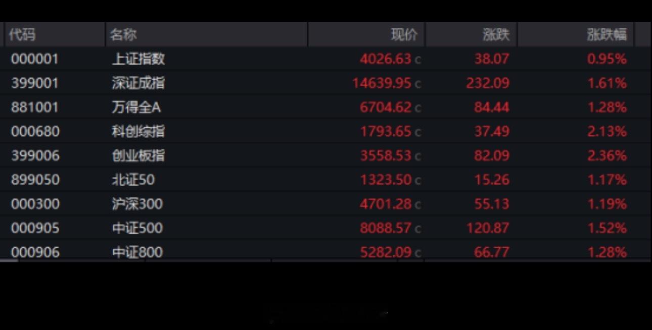 沪指盘中强势震荡上扬,尾盘涨近1%;创业板指、科创综指较为强势。截至收盘,沪指涨0.95%报4026.63点,深证成指涨1.61%,创业板指涨2.36%,科创综指涨2.13%,沪深北三市合计成交约2.4万亿元,较此前一日增加逾2300亿元。