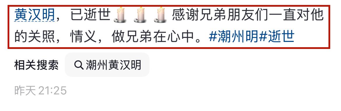 4月14号晚,潮州明的个人视频账号上公开了一则噩耗,潮州明不幸去世,按理来说,依照其过往的身份,怎么着也得有个像样的讣告吧?