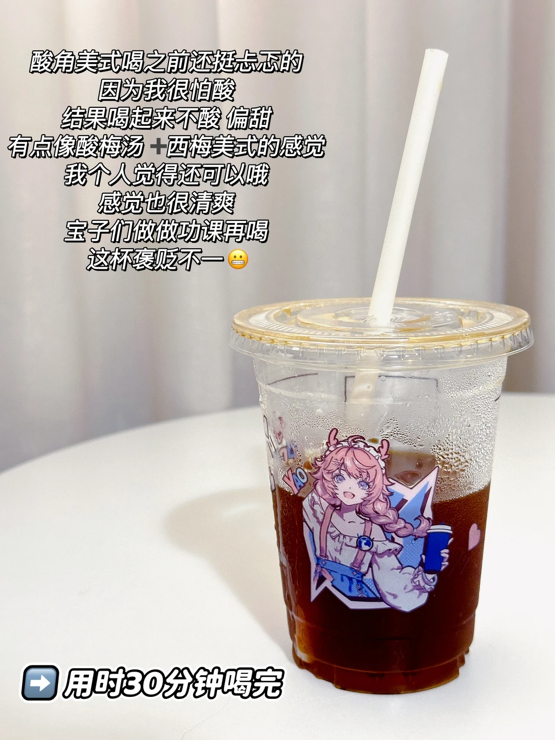 酸角美式喝之前还挺忐忑的,因为我很怕酸,结果喝起来不酸,偏甜〰️有点像酸梅汤➕西梅美式的感觉,我个人觉得还可以哦,感觉也很清爽[耶R]