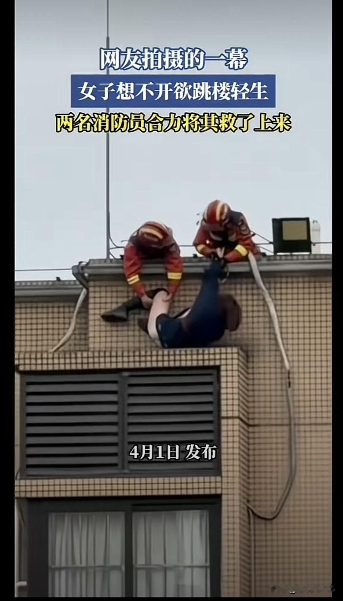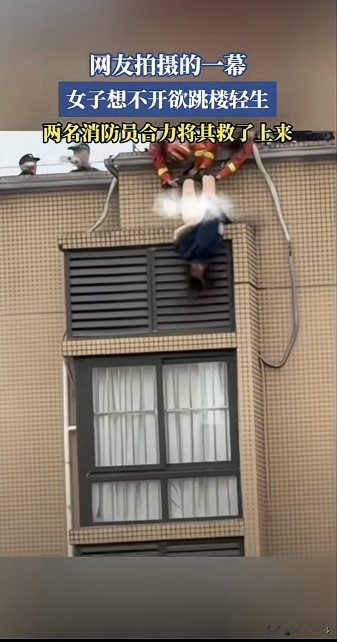 消防人员接到群众报警,冒着生命危险,把年轻的女士救了上来,为消防救援人员拍手叫好。