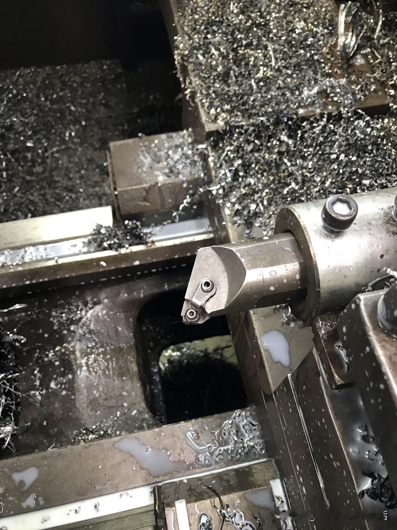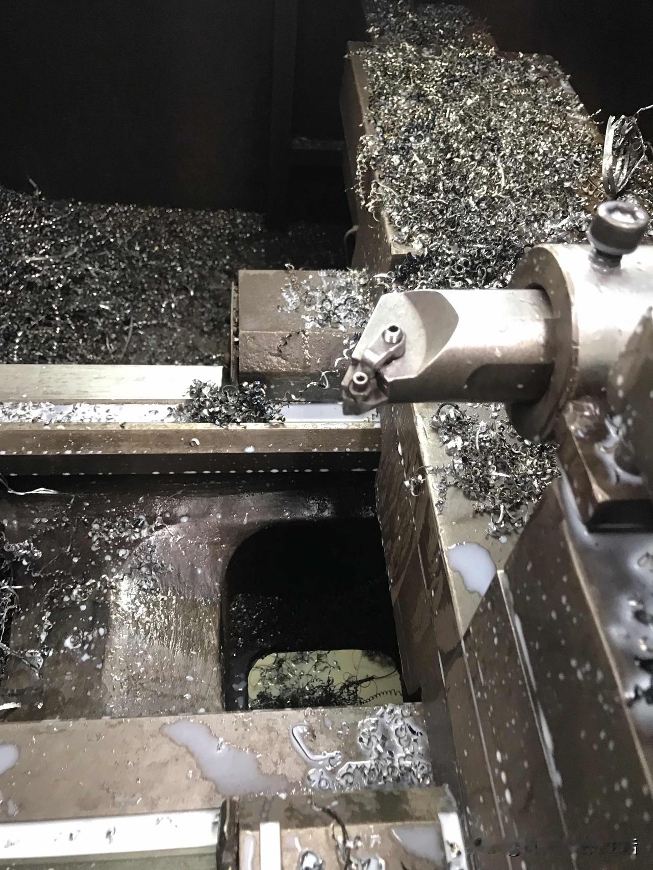 车个法兰而已,连刀杆都车坏了。话说:这是内孔风割出来的法兰,厚50,就车个内孔倒角留焊接使用的。这不是个很简单的活吗?简直就是信手拈来,程序编辑好对好刀具,一把刀具车到底不就完事了,门一关就安心的去玩了,反正车一只也要几分钟。风割过的表面有些硬,而且还十分不均匀,转速80每分钟,走刀量0.05,绿键一按,等车完就自己会停机,才车了8件,打开门一看,傻眼了,这刀片咋不见了,刀垫还有一些,刀头磨了一大块,赶紧藏起来不让老板知道……