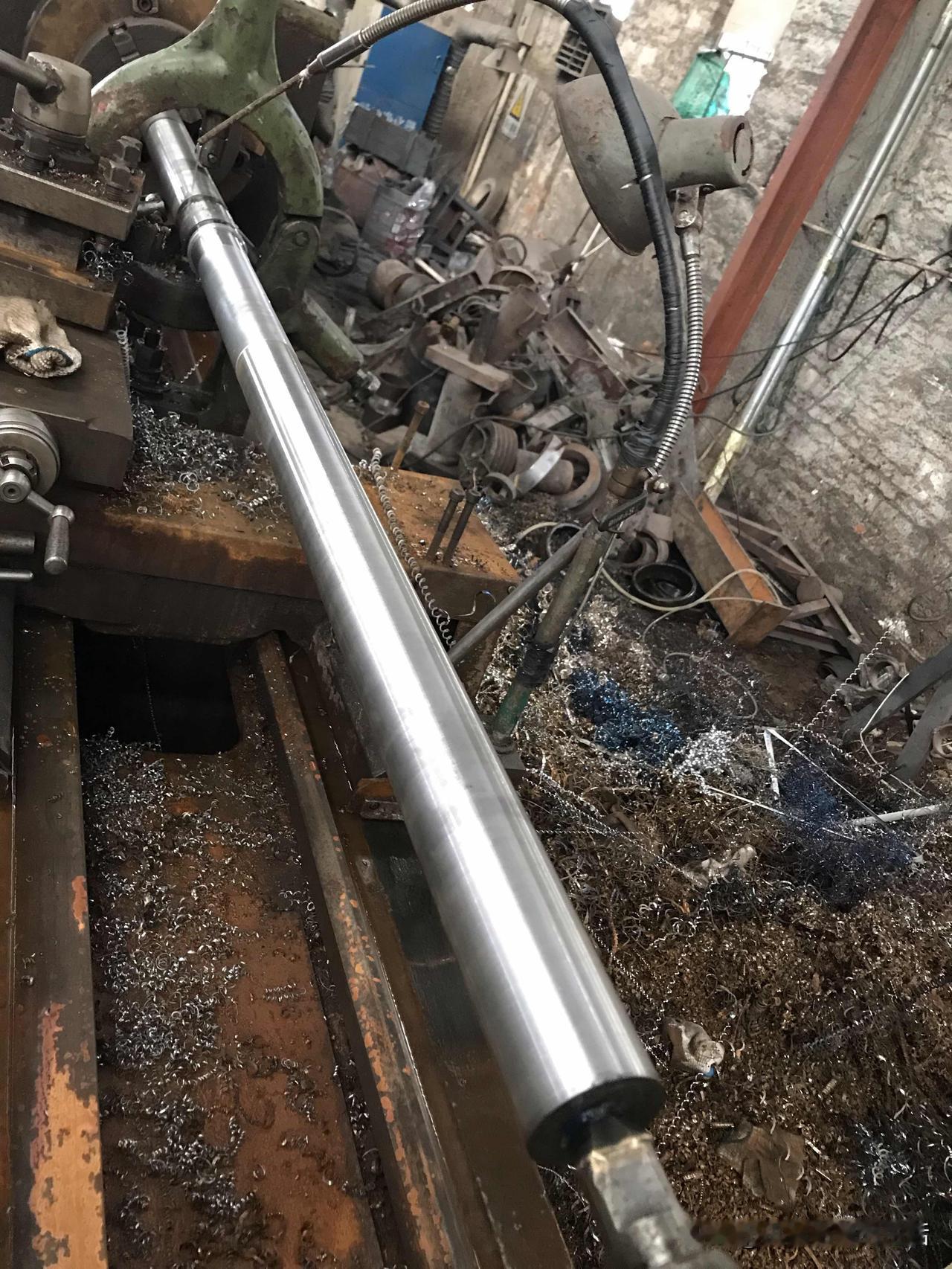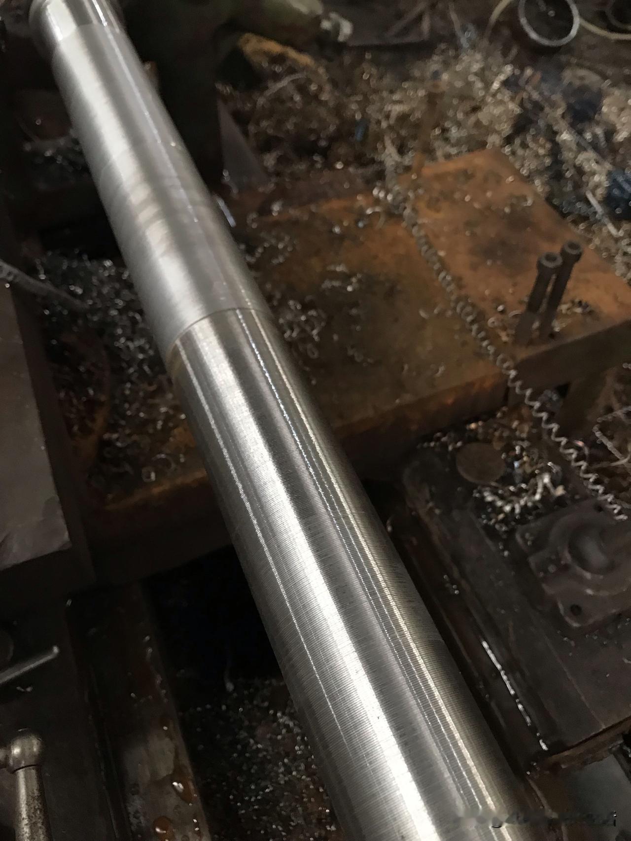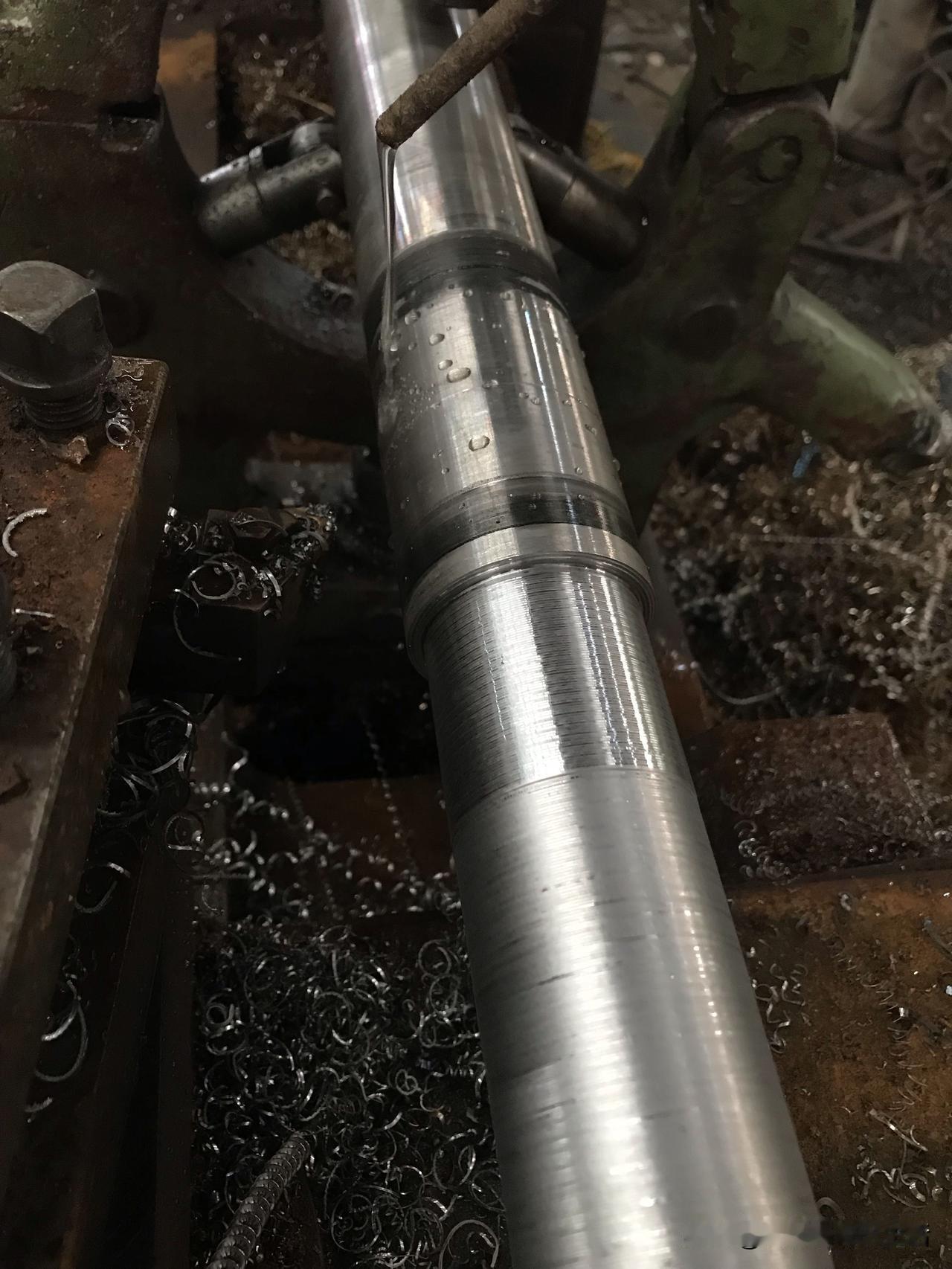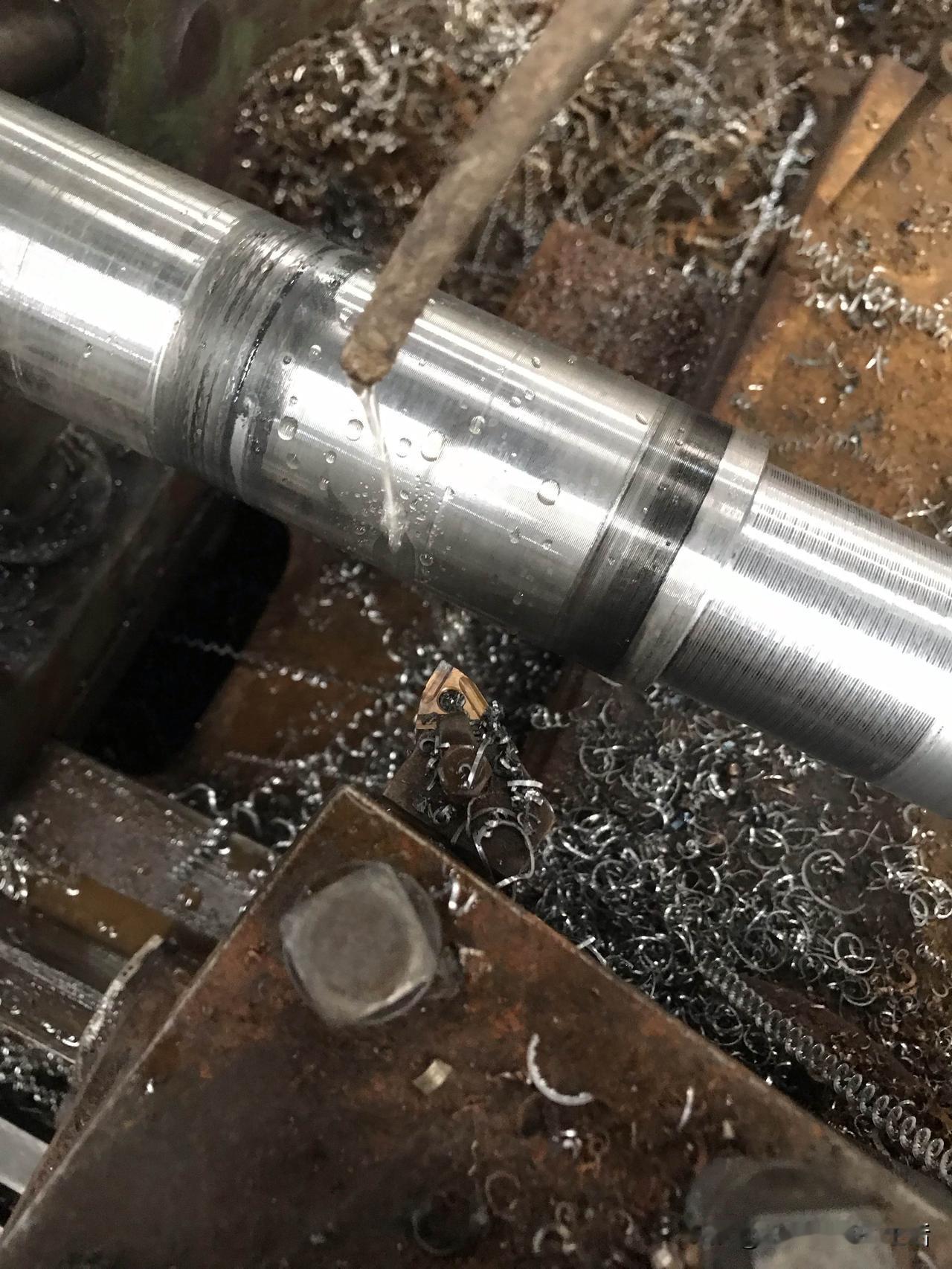 好好的一根轴,车着车着就废了!话说5000块月薪的车工大师傅,老板安排他车细长轴,总长1.9米,外圆车好了,接着就是开台阶,习惯了使用机夹刀的他,不会磨普通车刀,车起来很需,于是就用中心架扶着车一段,再移中心架,扶着再车一段,台阶要车600mm长,车着车着发现接不上刀了,一松中心架发现跳动厉害,于是打一下表才2.5mm跳动,但是已经没有余量挽救了。所以说机夹刀还是要用得对才行