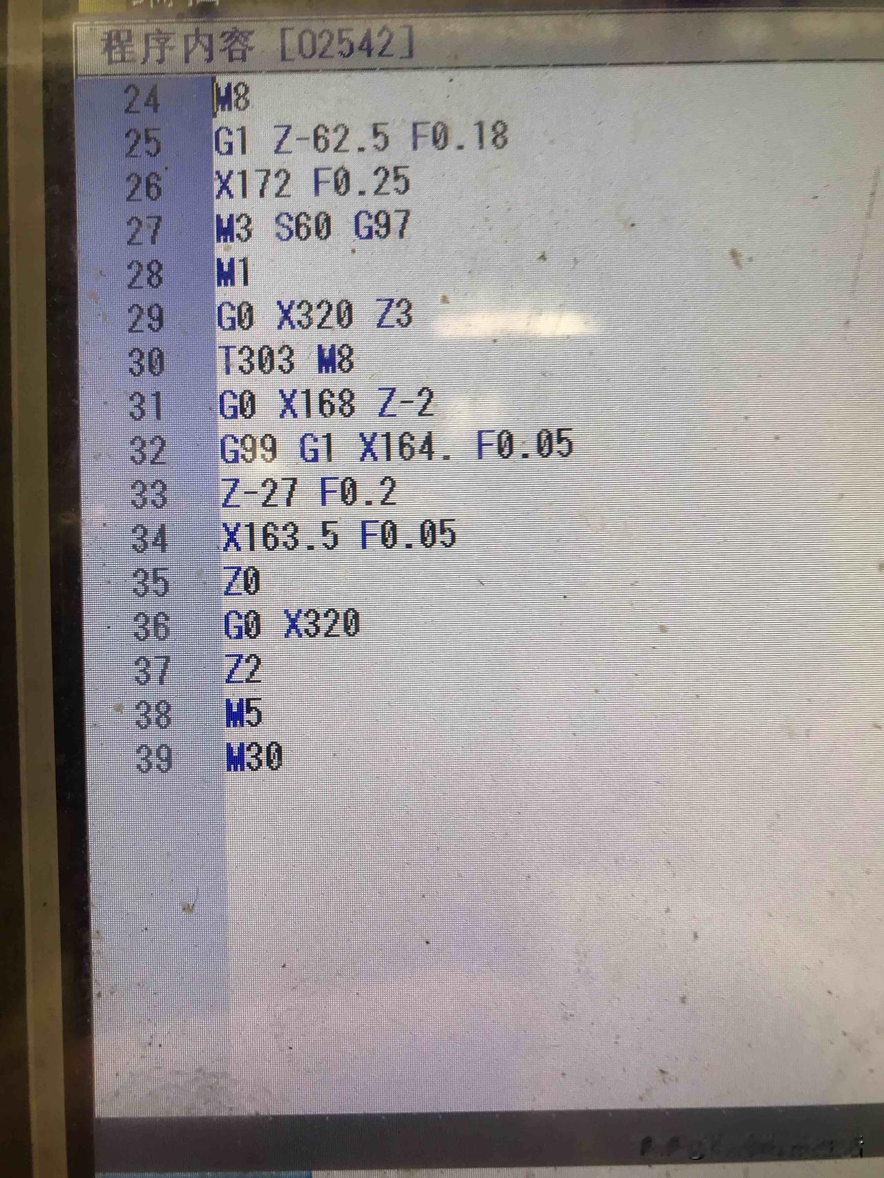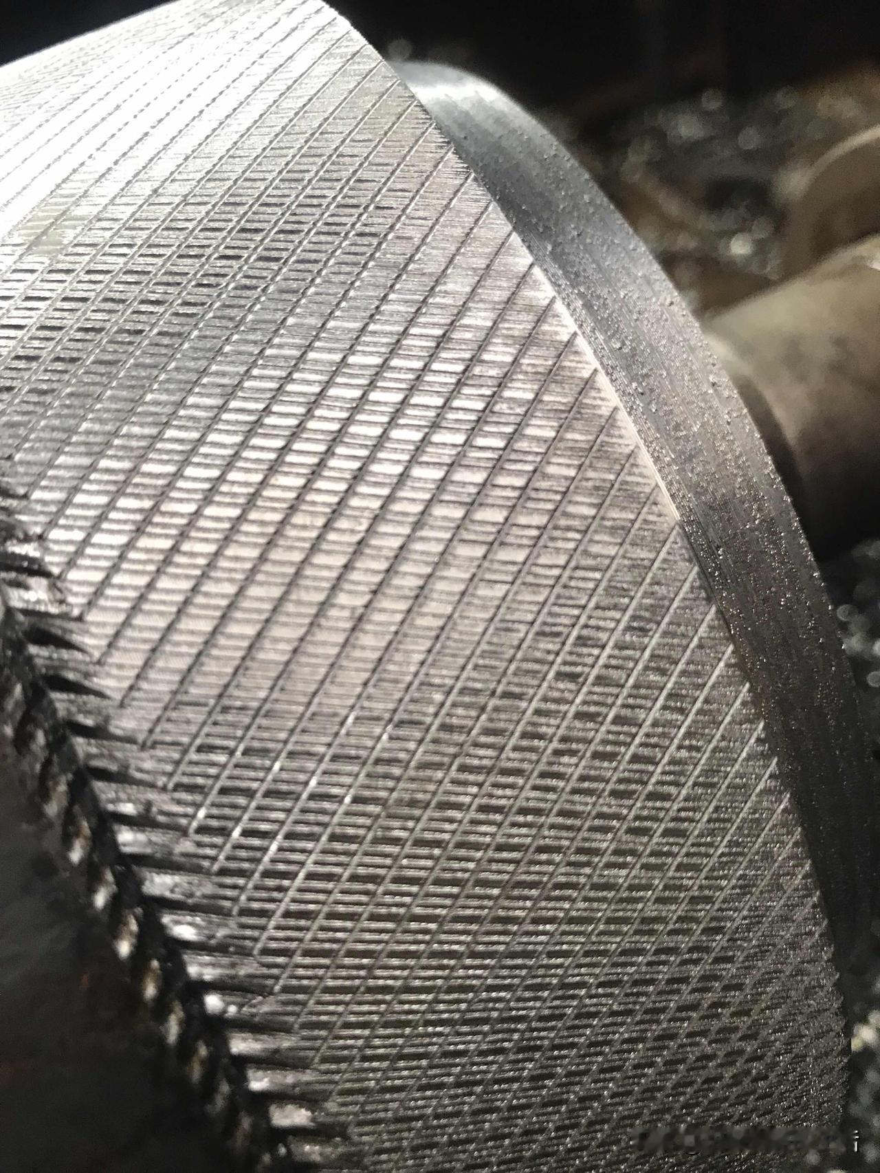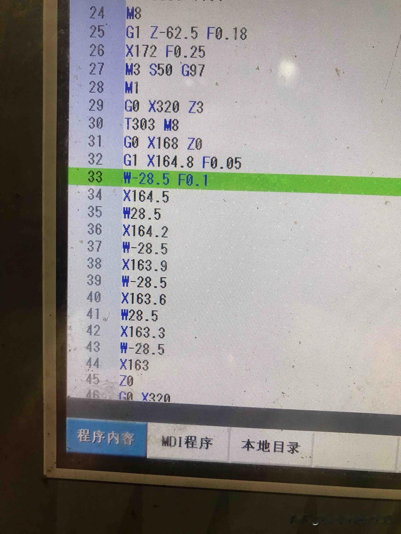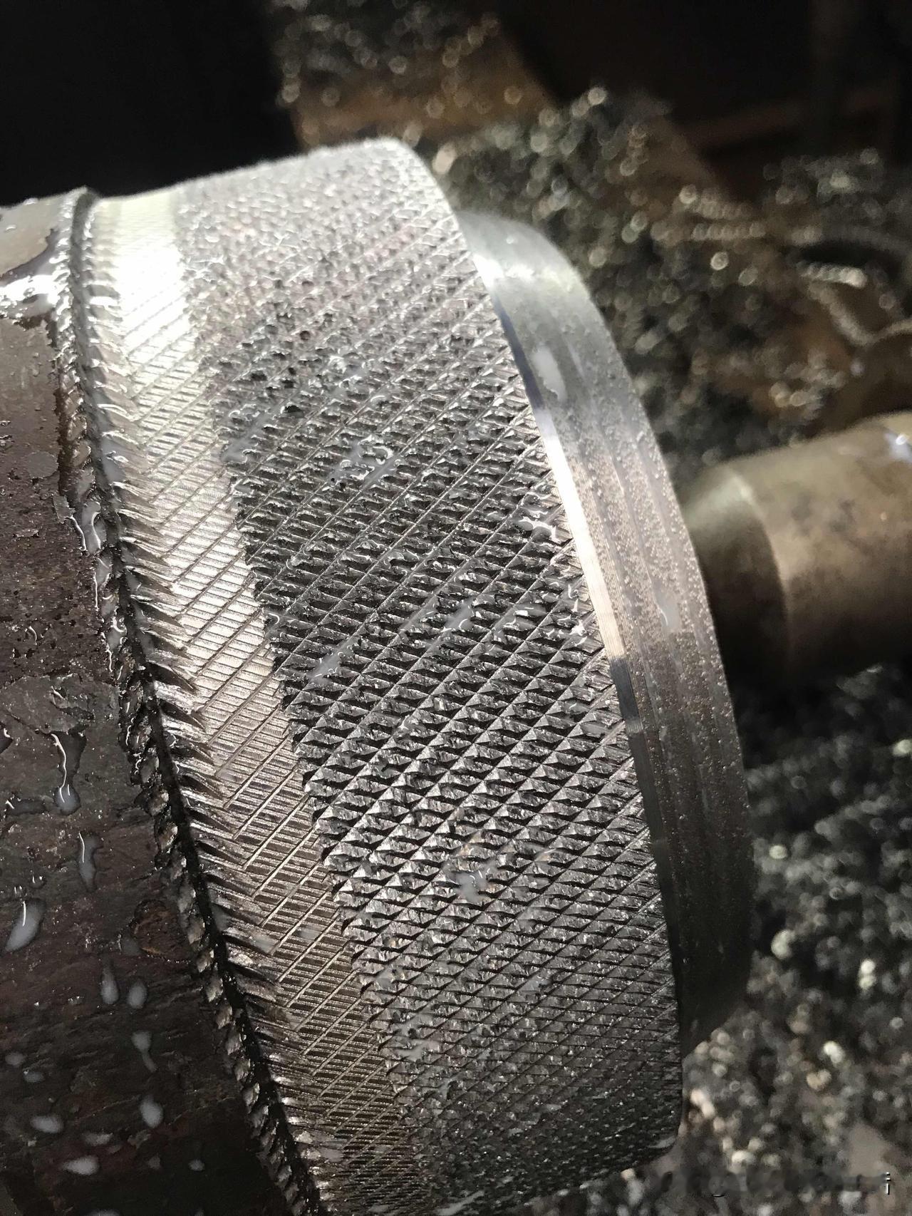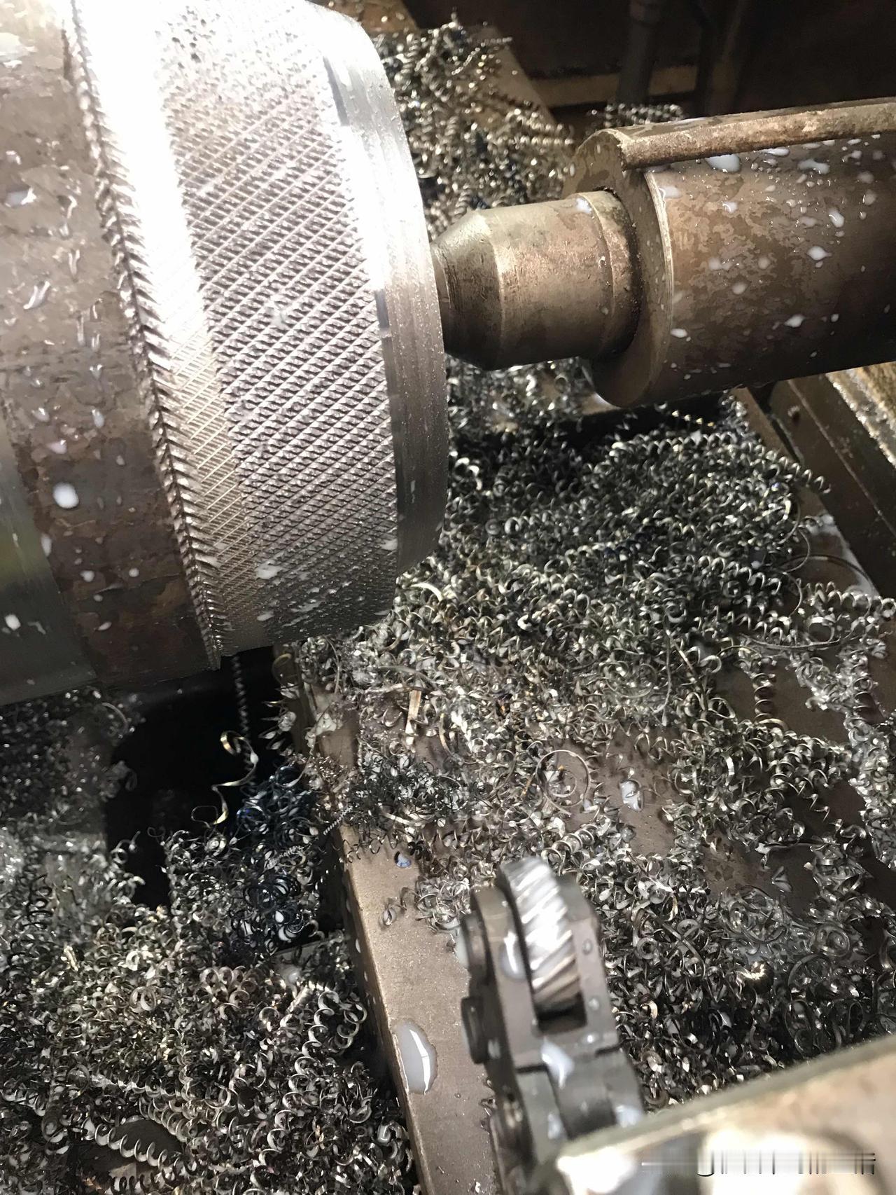 第一次用数控车滚花,心里实在是没底。话说,因为这个台阶是过盈配合的,一时记错了尺寸,一下就车小了几十丝,于是想通过滚花来补救。就按照普通车床的思维去编程,于是编辑好了程序,绿键一按开始滚压起来,不知啥的,滚过头了,赶退刀检查程序,也看不出啥问题,估计是不能用W来编程,于是就重新编程,不搞那么复杂,每滚压一次就用调刀补来进刀。不一会就滚压好了,虽然压得不漂亮,但是没所谓,尺寸变大了就可以,通过这次在数控车滚花,也程累了些经验