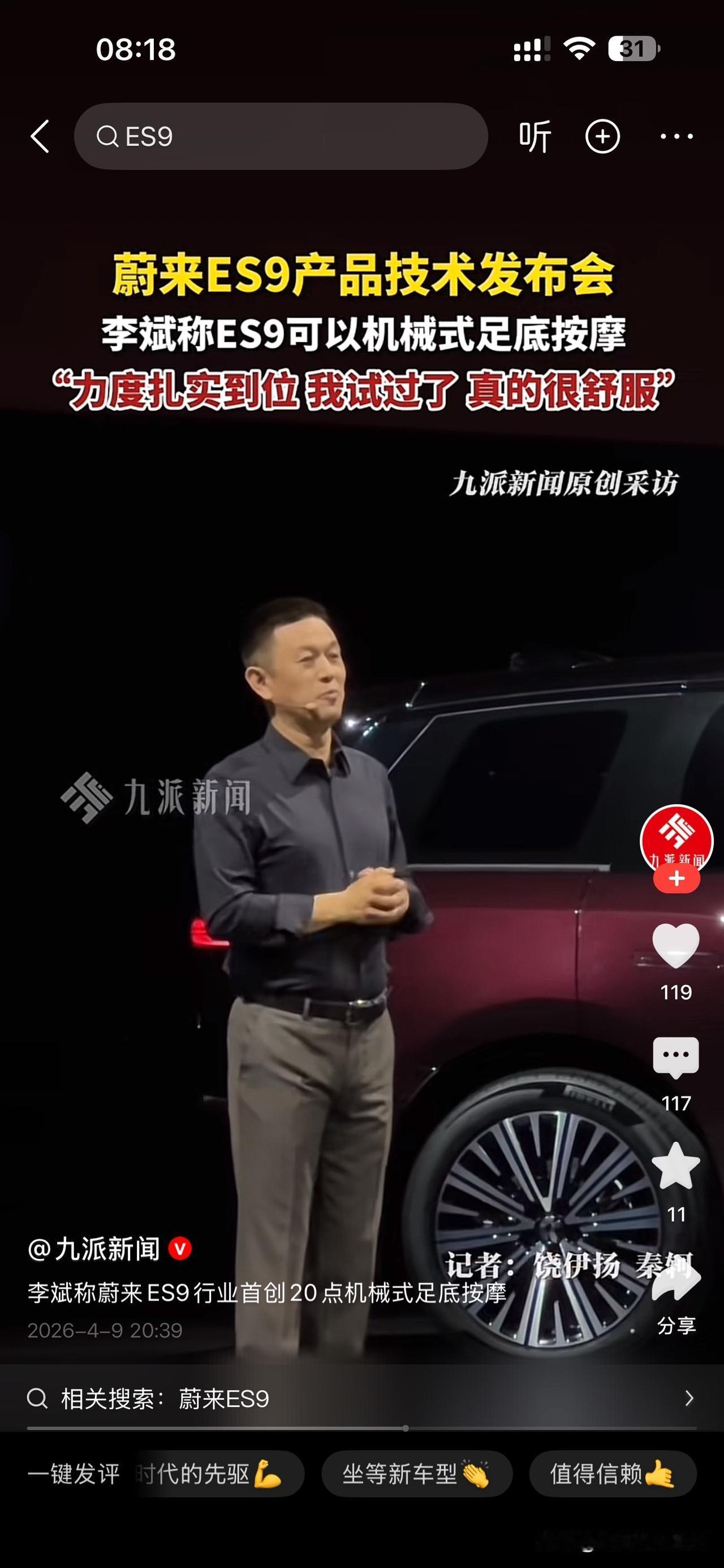 本来以为又是一场新能源车常规发布会,什么芯片、平台、悬架、智能驾驶,结果看到这句我是真绷不住了:李斌亲自认证,ES9机械式足底按摩,力度扎实到位,我试过了,真的很舒服……