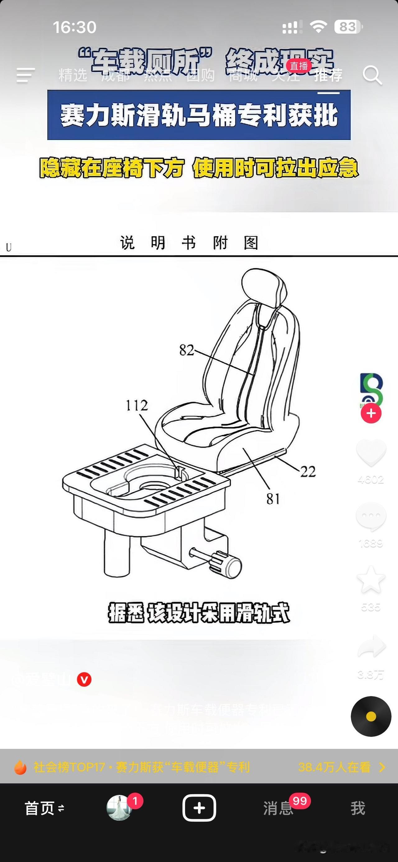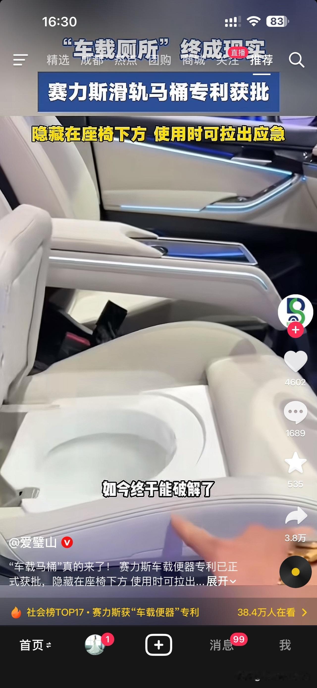 结果这两天更狠的来了。赛力斯车载马桶专利正式获批,平时藏在座椅下方,不占空间,真遇到长途内急,拉出来就能应急,用完再推回去。