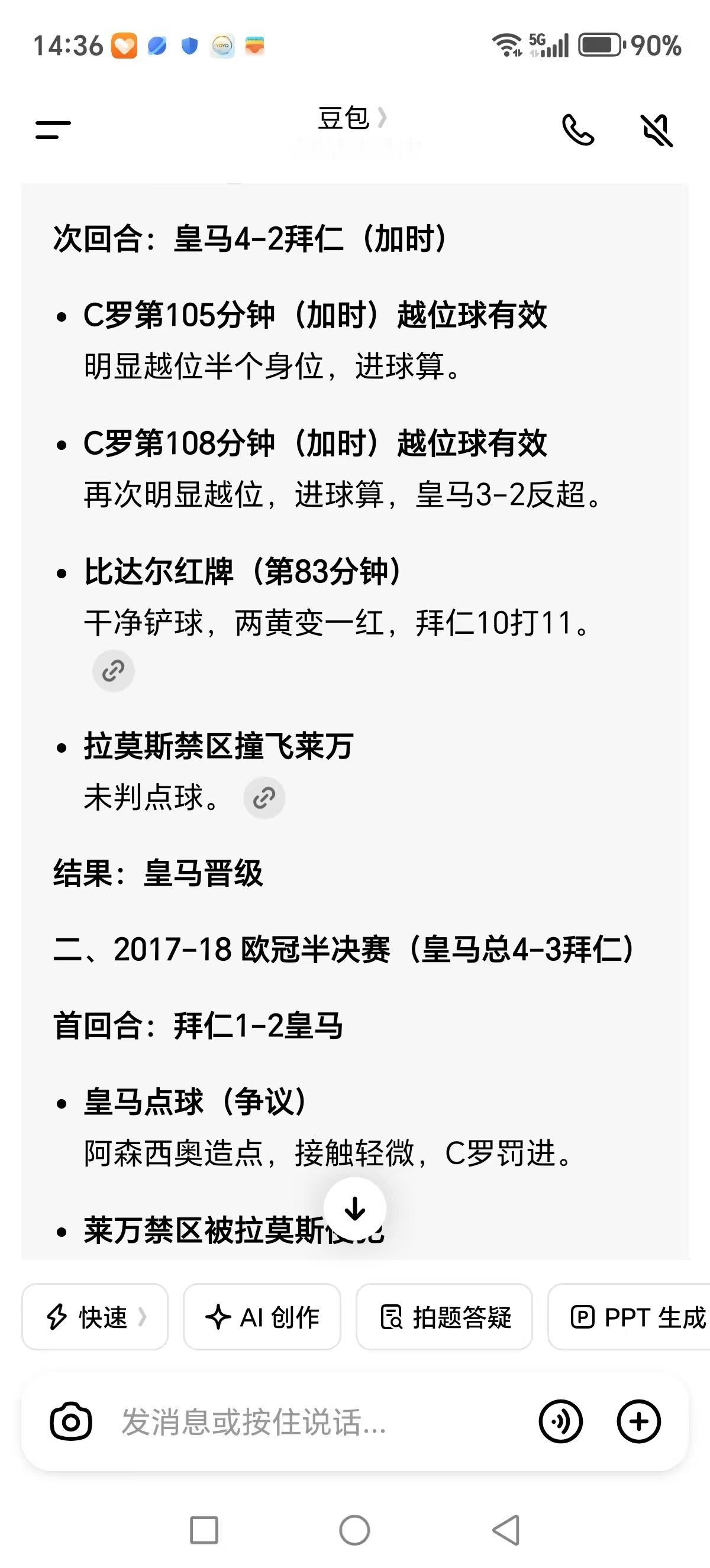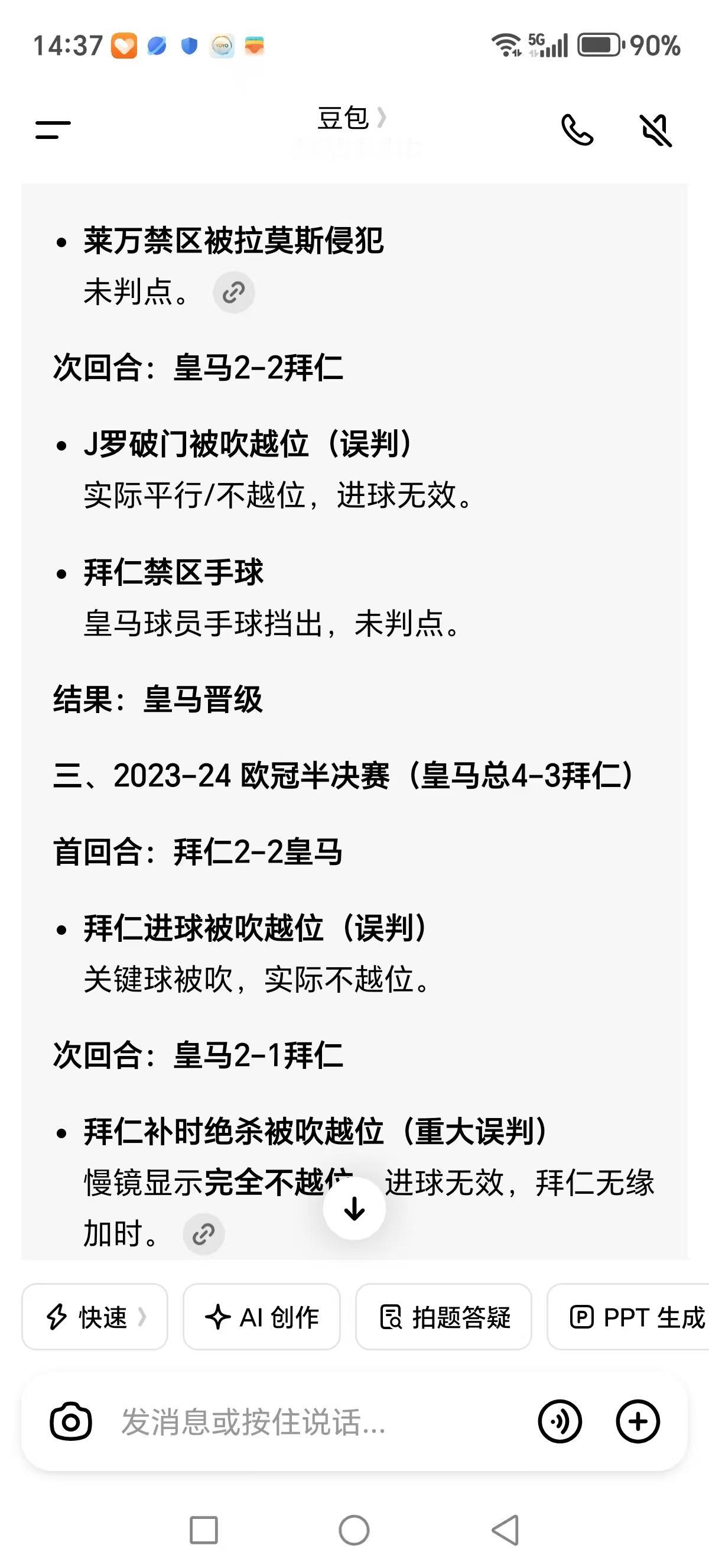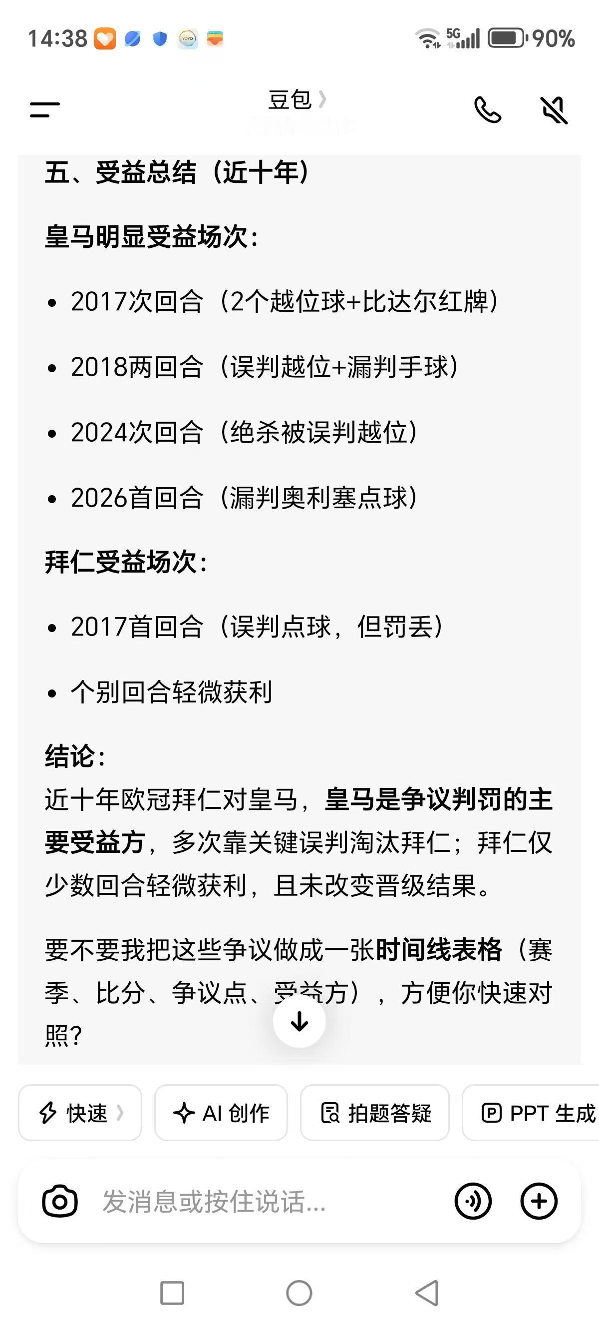 于是我便问豆包,让豆包列举了一下拜仁和皇马十年欧冠相遇的所有争议判决,豆包总结出来:最终全是皇马获利!以下是豆包的总结: