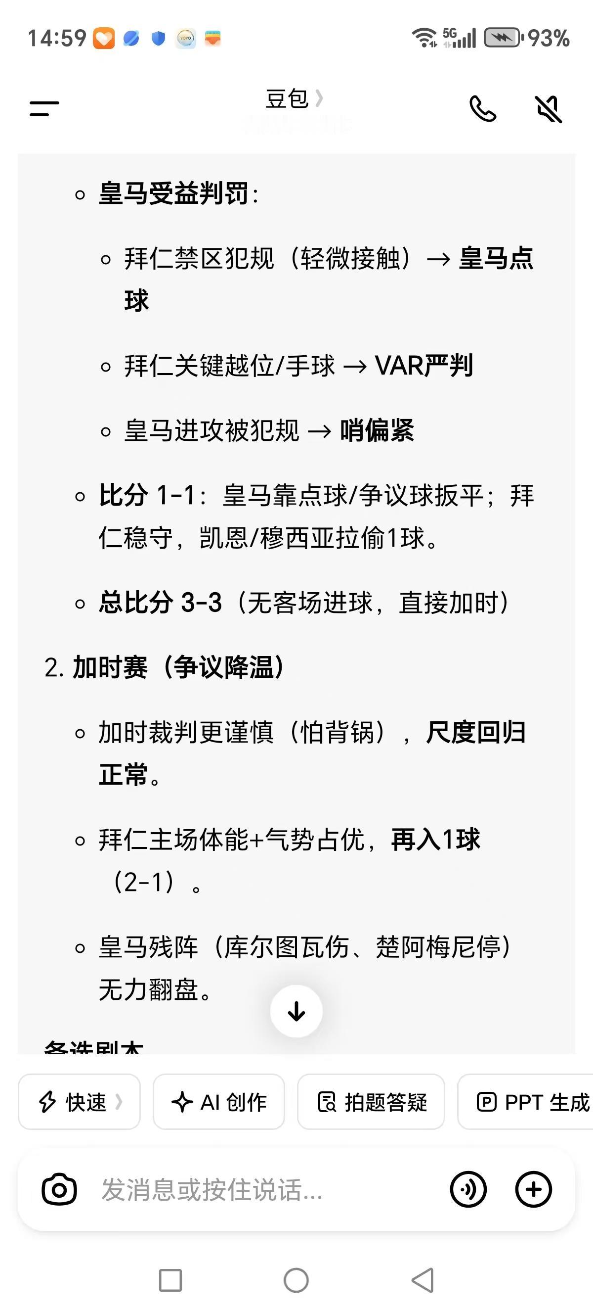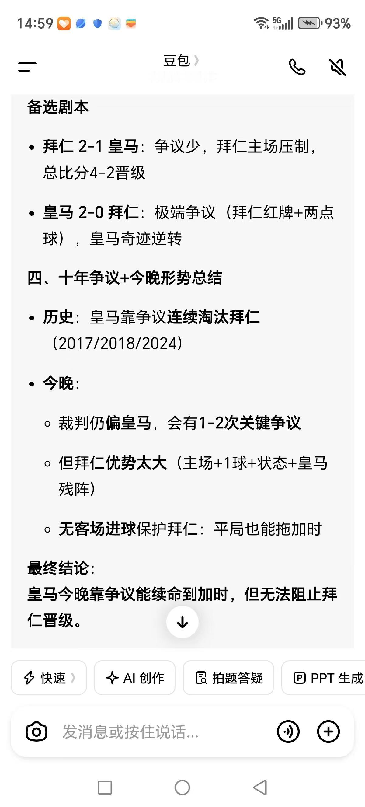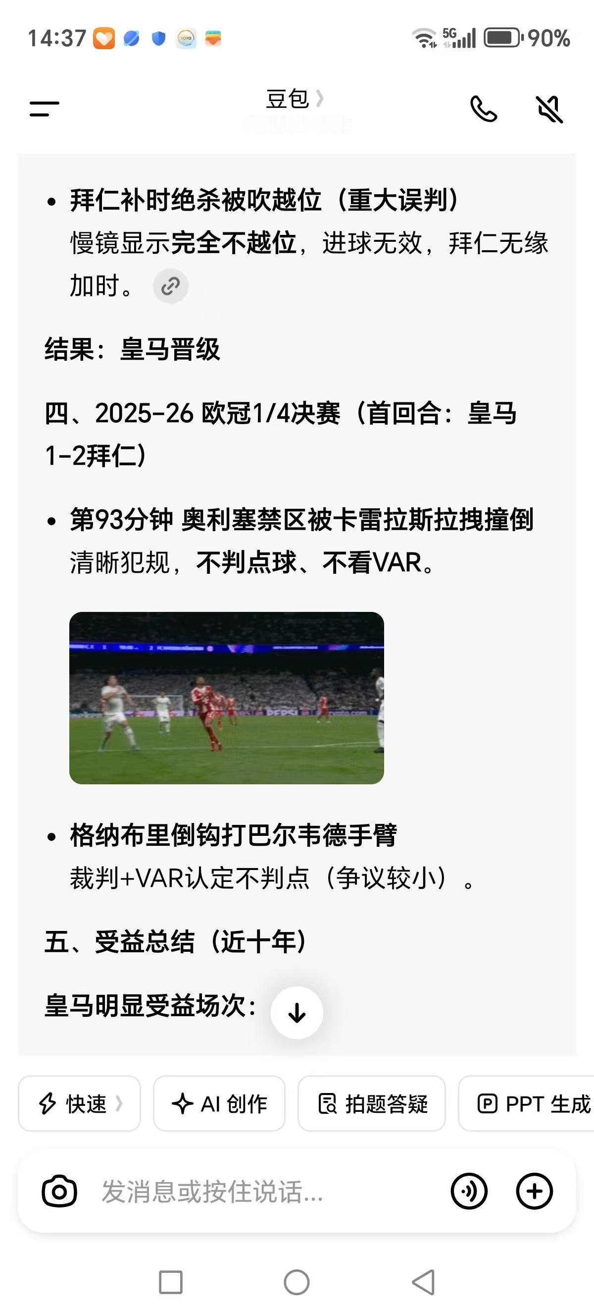 然后我再根据豆包的总结,豆包推翻了先前拜仁强势晋级的必然结果,因为有争议判罚再像十年间那样皇马依靠关键误判受益,那么豆包给出不同的剧本,拜仁晋级。极端争议结果是拜仁被皇马在常规时间淘汰拜仁,总体还是看好拜仁晋级,只是出现了变数。