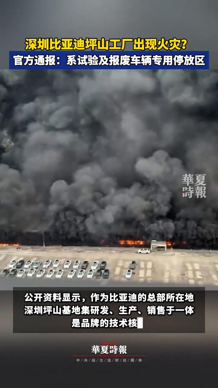 深圳比亚迪坪山工厂出现火灾?官方通报:系试验及报废车辆专用停放区。 华夏时报。