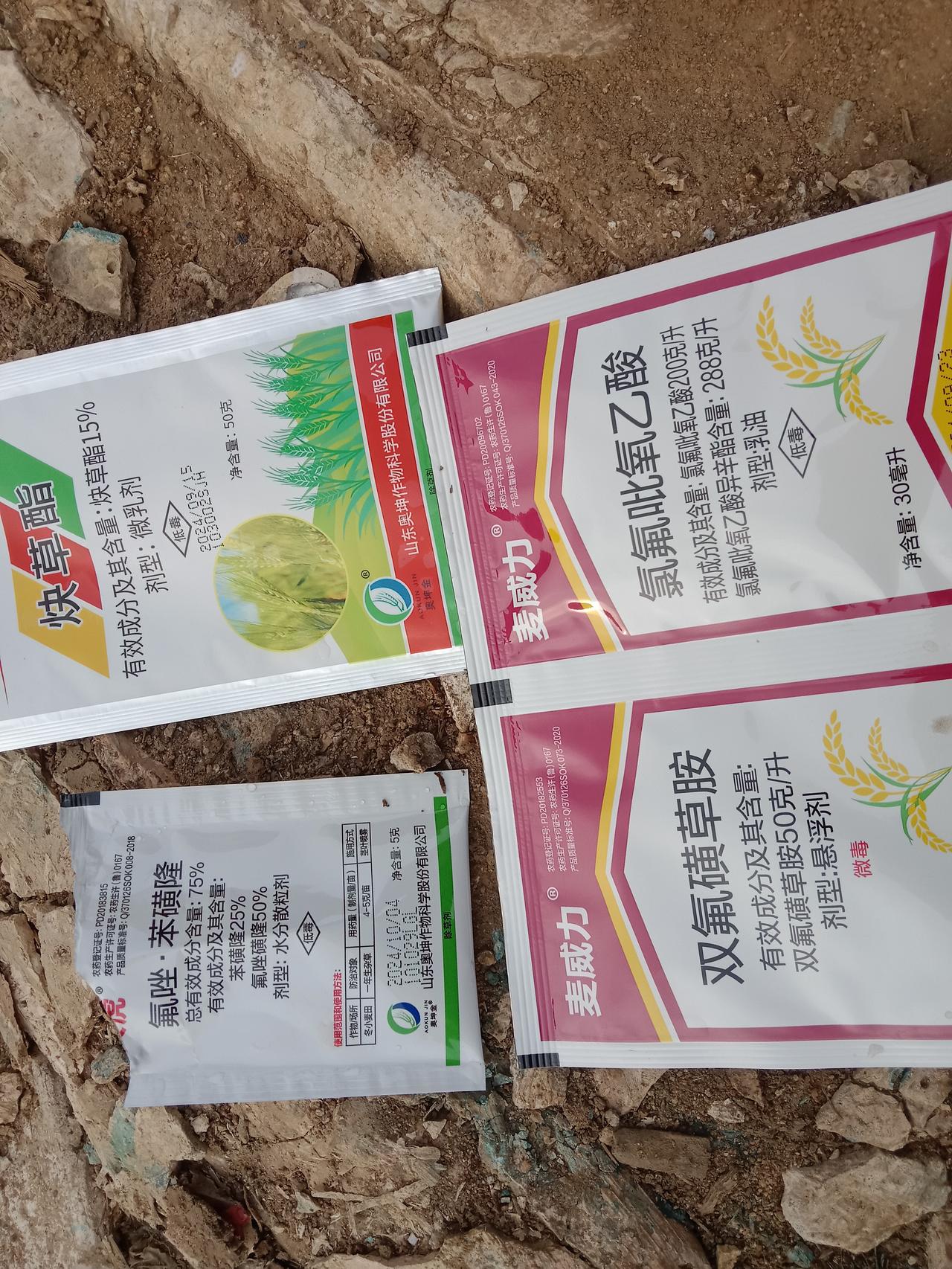 今天咱选择了这款除草剂套餐,四种药配比全方位的去除杂草,虽然用量多一点,但效果不比“巨星”差,最主要的是安全性比较好,不伤小麦。