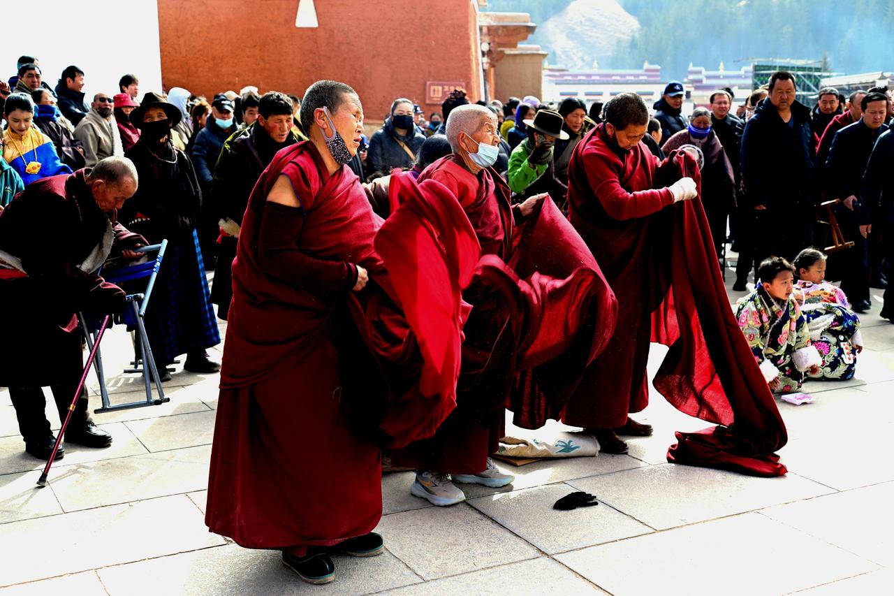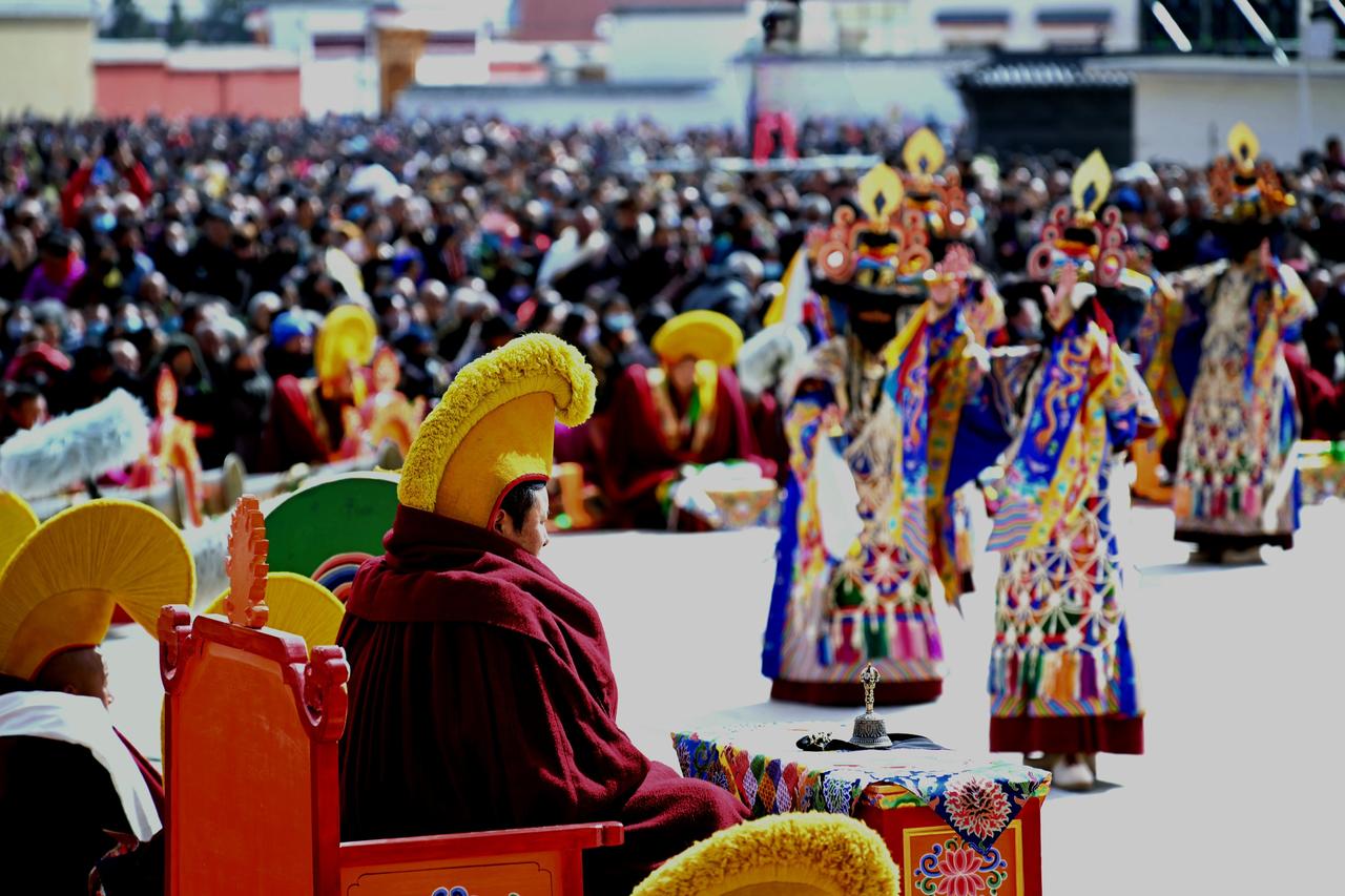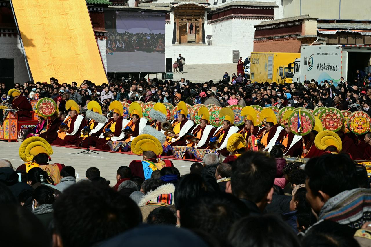 法号沉厚,僧人身着彩衣、戴面具缓步起舞,动作庄重刚劲,在高原天光中透出千年仪轨的