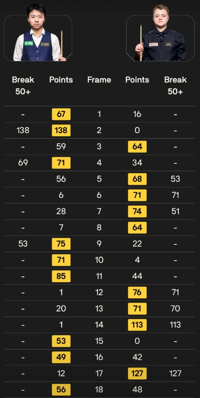 穆迪在世锦赛资格赛“审判日”和同为00后的中国小将江俊打满19局,最终以10-9惊险过关,他成为2007年的特鲁姆普之后首个亮相克鲁斯堡剧院的年轻球手!