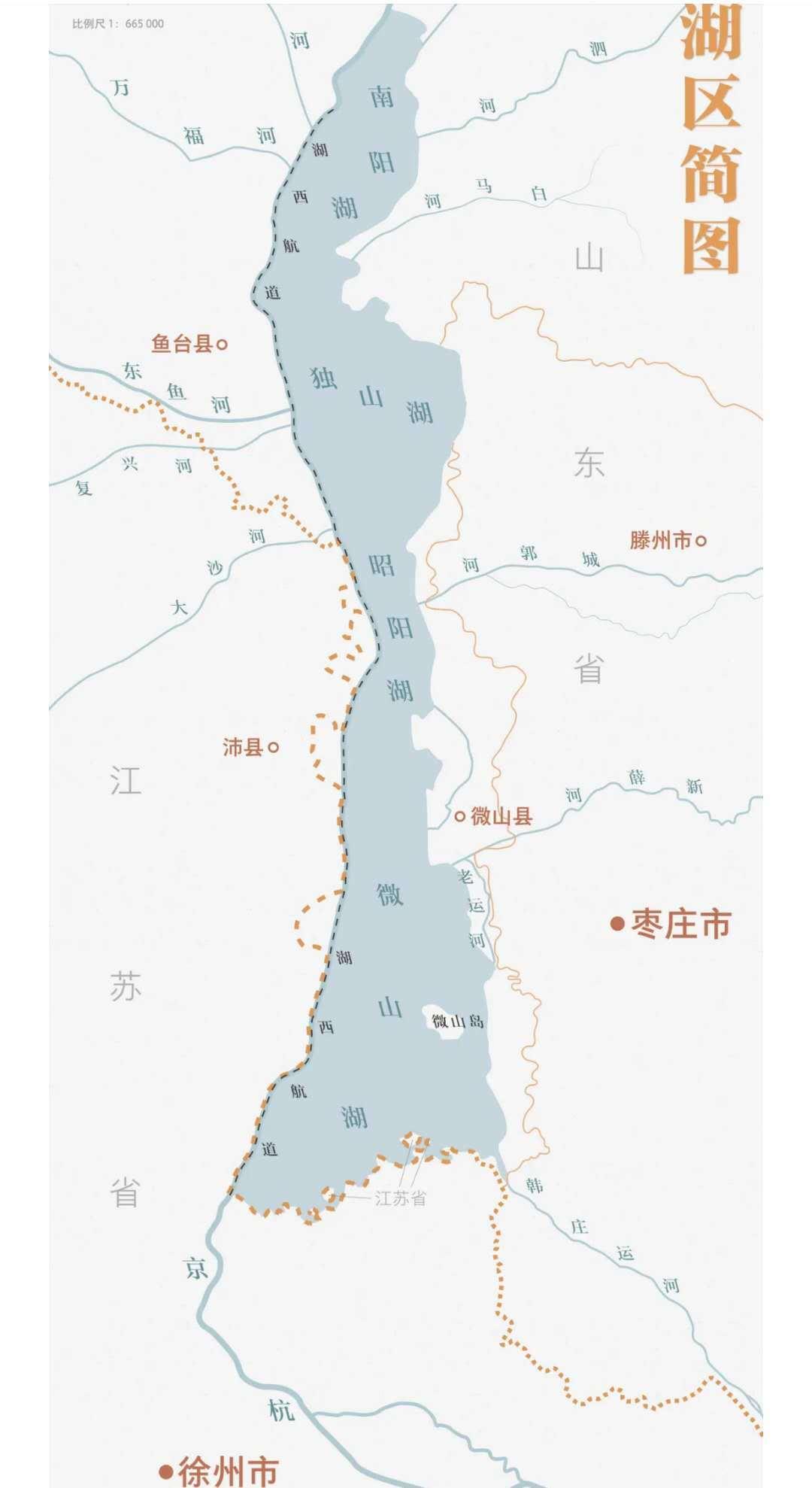 微山湖“流域水系、湖区范围、卫星影像”系列图景。广义的微山湖,位于山东与江苏交界处,京杭大运河西岸,由南阳、独山、昭阳、微山四个湖泊呈南北纵向构成,又称南四湖。湖面长126千米,宽5-25千米,总面积约1266平方公里,是山东省第一大淡水湖。狭义的微山湖,则在南四湖最南端,为四湖中面积最大。微山湖属断陷湖,地处郯庐断裂带上,一方面因地壳运动在苏鲁平原出现地势低洼区;同时也因黄河夺泗(水)改道,泥沙涌灌导致下游河床抬高,水系迟滞断堑洼地而形成。微山湖初由苏鲁两省八县共管,但争议较大,多有不便。五十年代山东省成立微山县,八十年代与江苏省协商区划调整,最终确定实际管理归属。