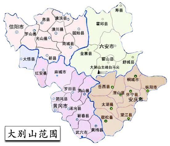 大别山,广义构造属秦岭-桐柏山脉的东向延伸,地跨鄂豫皖三省。山区大范围涵盖安徽六