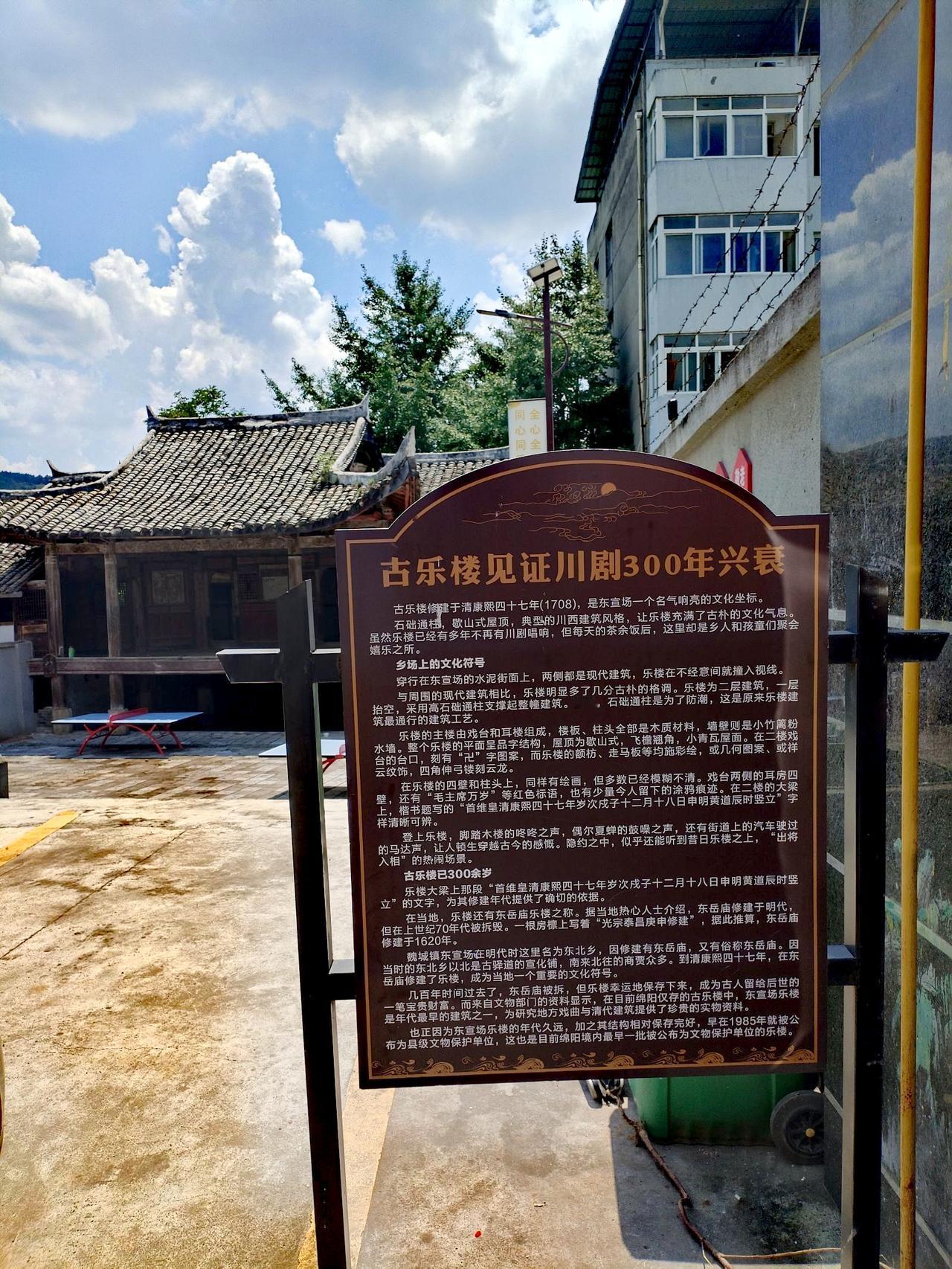 东宣古乐楼戏台,位于四川省绵阳市游仙区魏城镇东宣场(原建制乡镇,今东宣社区)。修建于清代康熙年间后期,整体分上下两层,下层抬空,采用石础通柱设计,起到防潮作用,屋顶构造为歇山式。在乐楼戏台的枋、梁、柱、墙等位置,均绘有彩画图案,融入了传统故事背景。该戏台是本土地方戏剧展演的公开场所,并作为旧时代人们追求精神文化熏陶的核心聚集地。而在这座川北乡场上,更承载其文化地标符号。