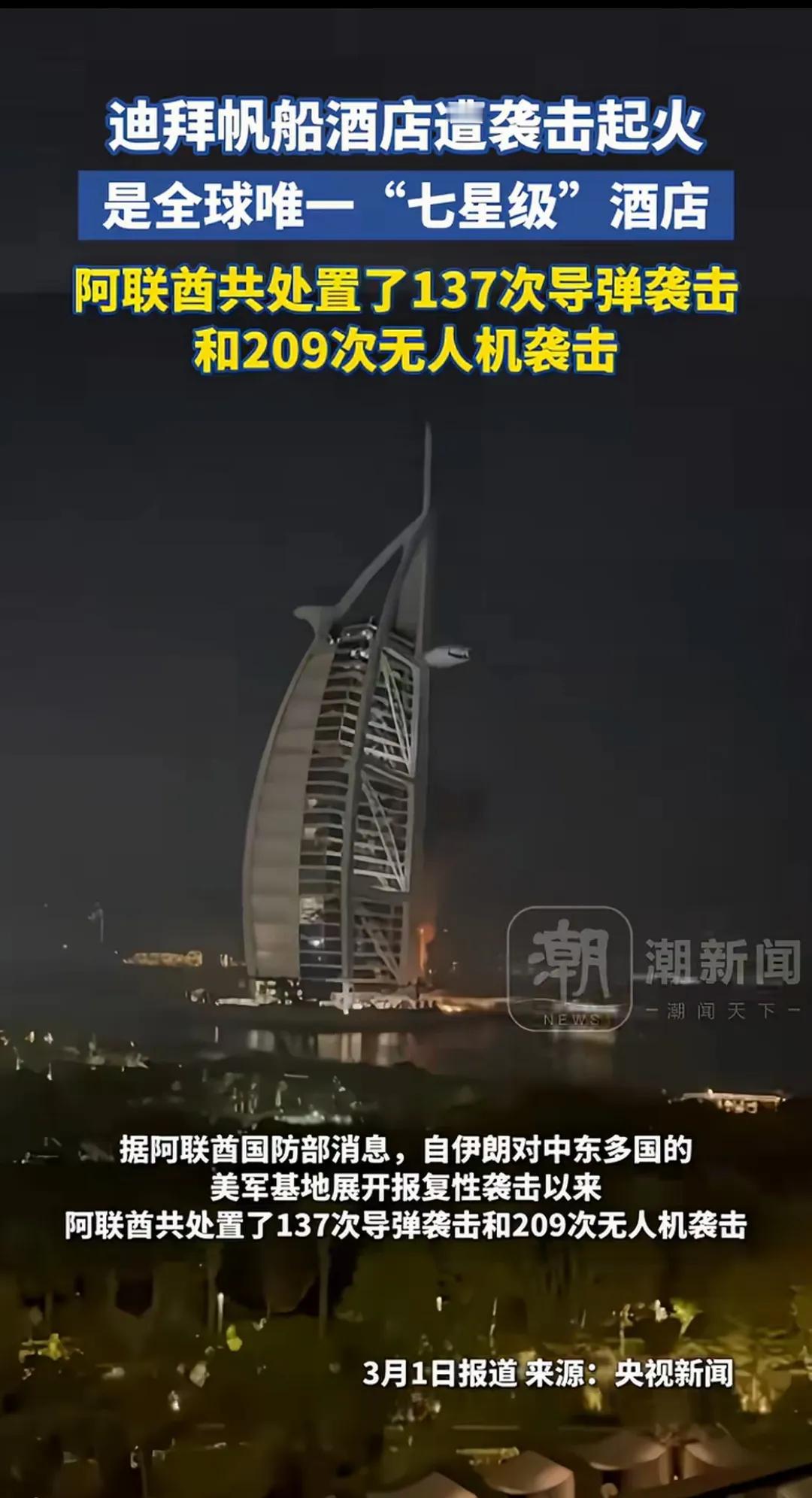现在最惨的应该是阿联酋,迪拜国际机场被炸了,迪拜最高建筑哈利法塔也被炸了,就连全球唯一的七星级酒店——迪拜帆船酒店也被导弹袭击!