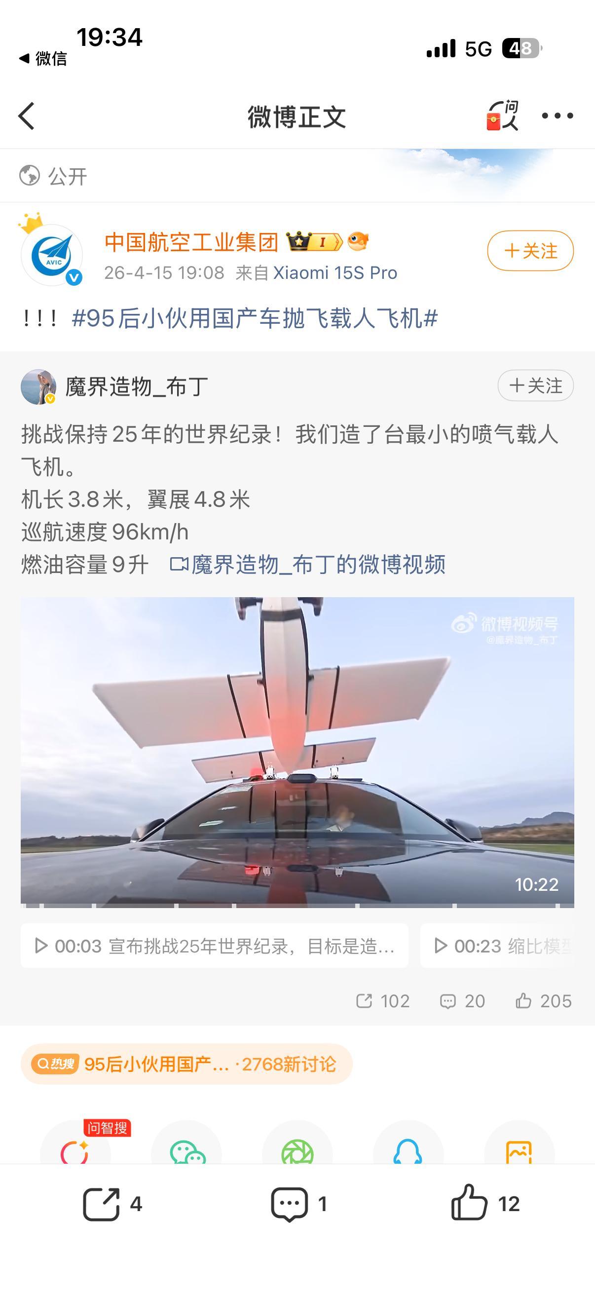 还记得《007》里那辆能飞的汽车吗?手工飞行器博主"魔界造物"小时候看完电影就立下flag:要做世界最小的喷气式载人飞机。几十年后,他做到了。更牛的是,极氪8X成了他的"起飞跑道"——近900匹动力、SEP超级电混系统、AI数字底盘,稳稳托住这架梦想之翼。当个人执念遇上中国制造,007的科幻场景成了现实。这就是极氪8X的含金量:不仅是一辆车,更是创新者的坚实后盾95后小伙用国产车抛飞载人飞机