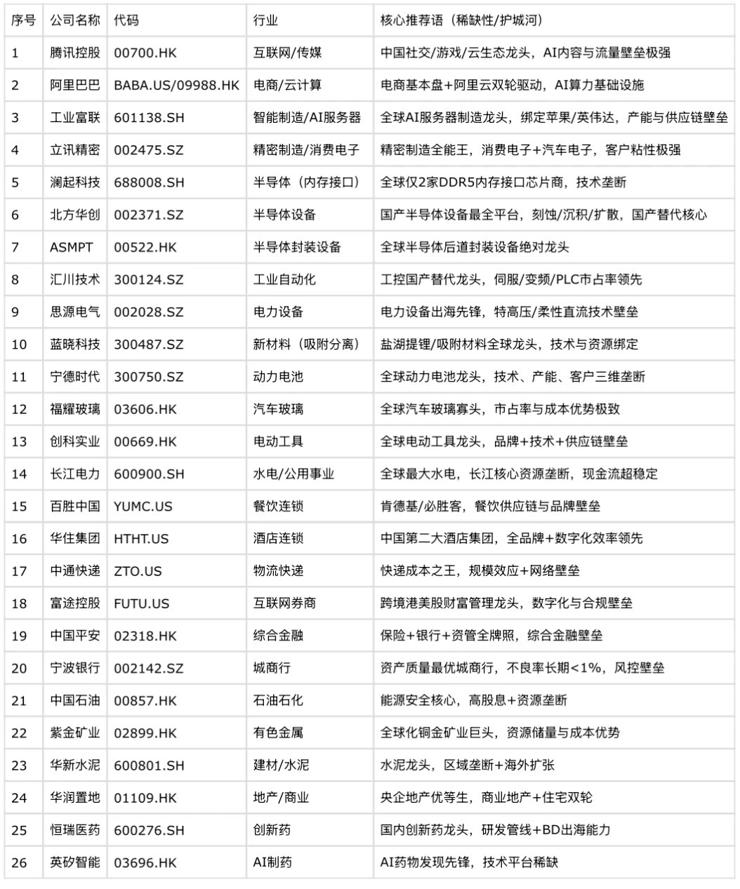 覆盖硬科技、高端制造、能源资源、消费服务与金融医药等领域,代表中国经济中最具竞争力、现金流稳定、长期确定性最强的龙头企业。