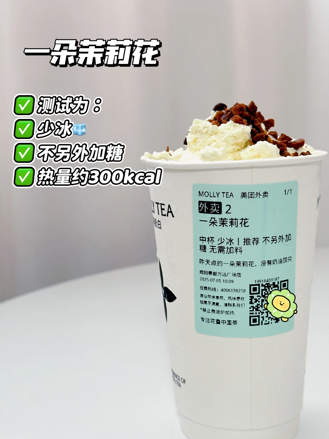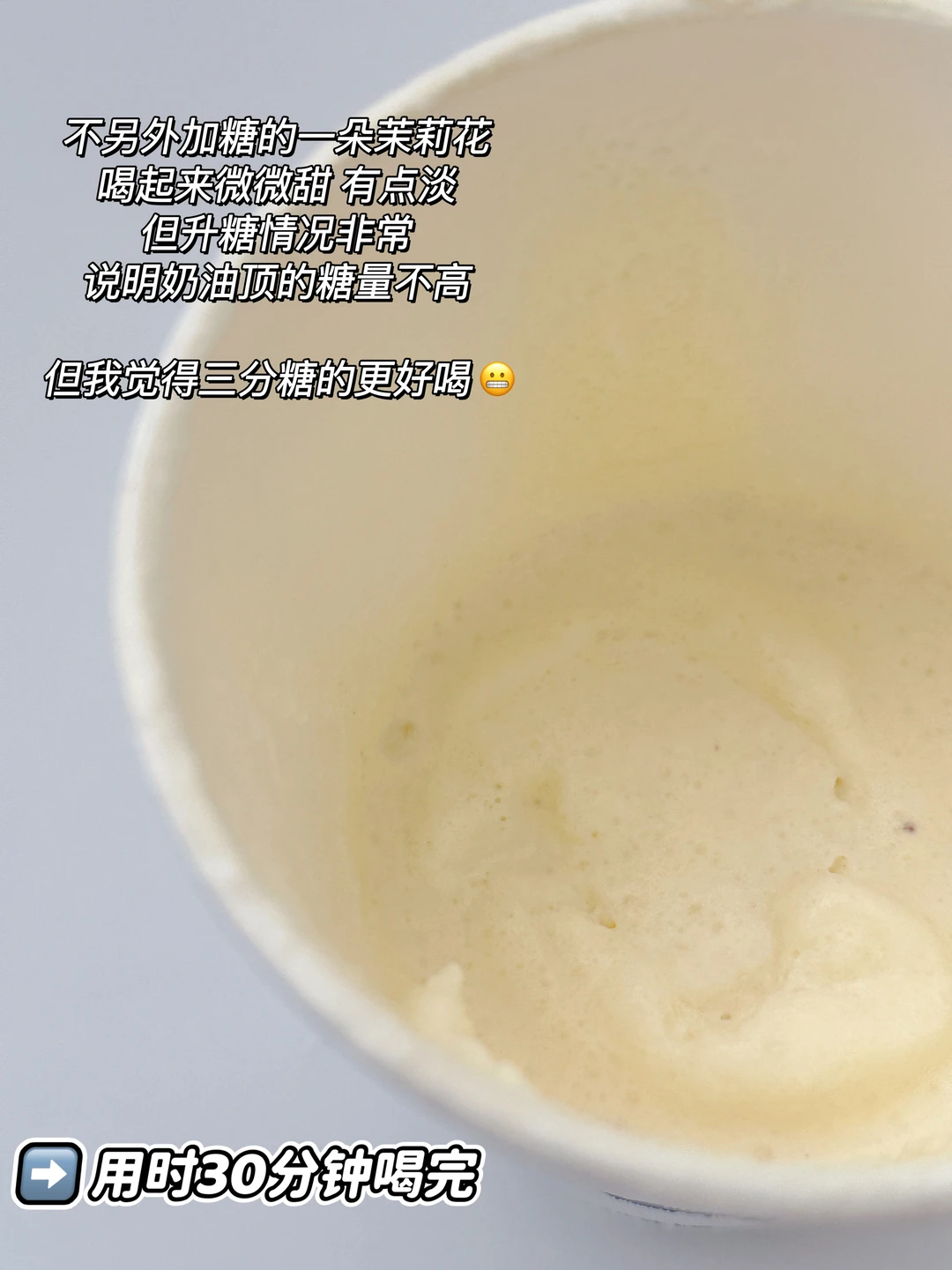 不另外加糖的一朵茉莉花,喝起来微微甜,有点淡,但升糖情况非常,说明奶油顶的糖量不高,但我觉得三分糖的更好喝😬