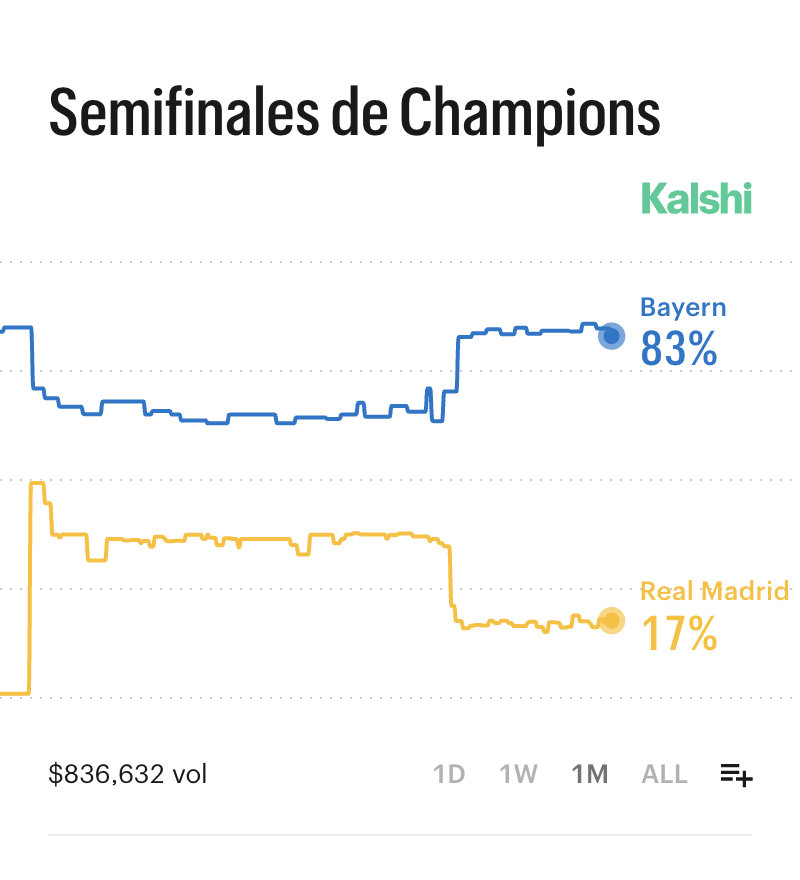 【预测平台Kalshi】拜仁vs皇马的欧冠比赛将是本赛季观看人数最多的欧冠比赛——预计9亿观众收看,今天皇家马德里逆转拜仁的概率为17%。
