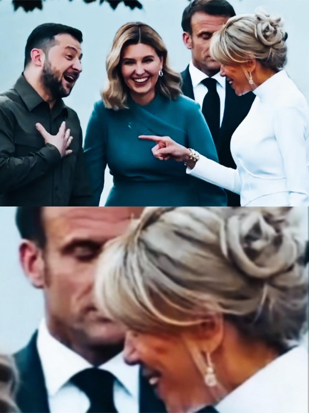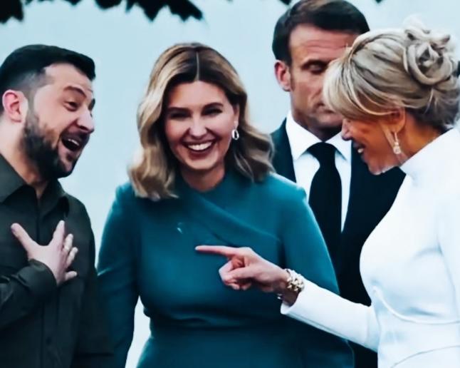 马克龙妻子和泽连斯基夫妇在说什么呢?三人都笑容满面啊! 三人一脸开心大笑的样子与