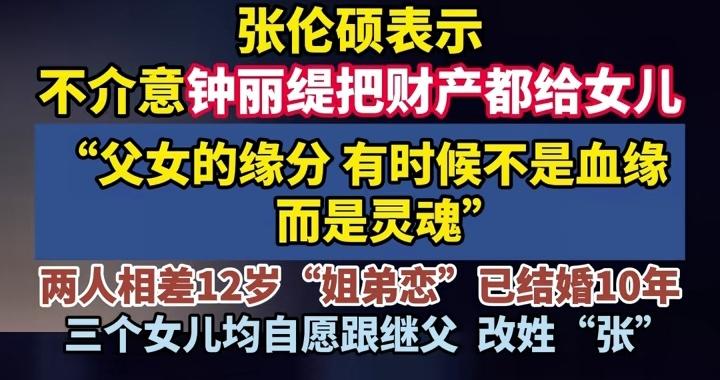 他和钟丽缇结婚,不仅在年龄上吃了亏,整整差12岁,钟丽缇还不给他生孩子,当然这跟3个女儿和高龄产妇风险有关系,如今,张伦硕又自曝,钟丽缇的财产都给三个女儿。
