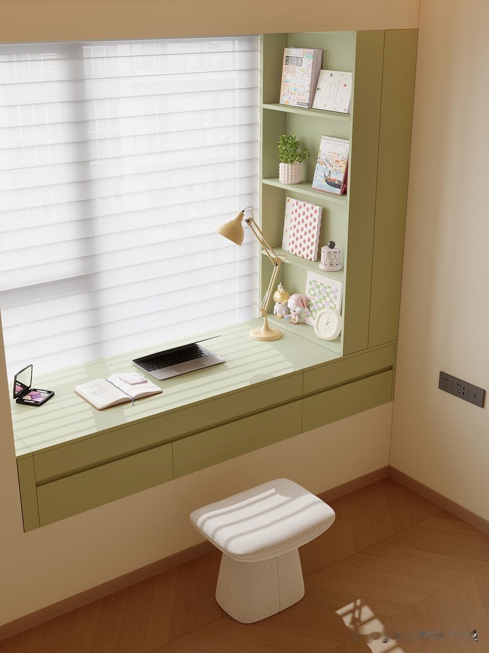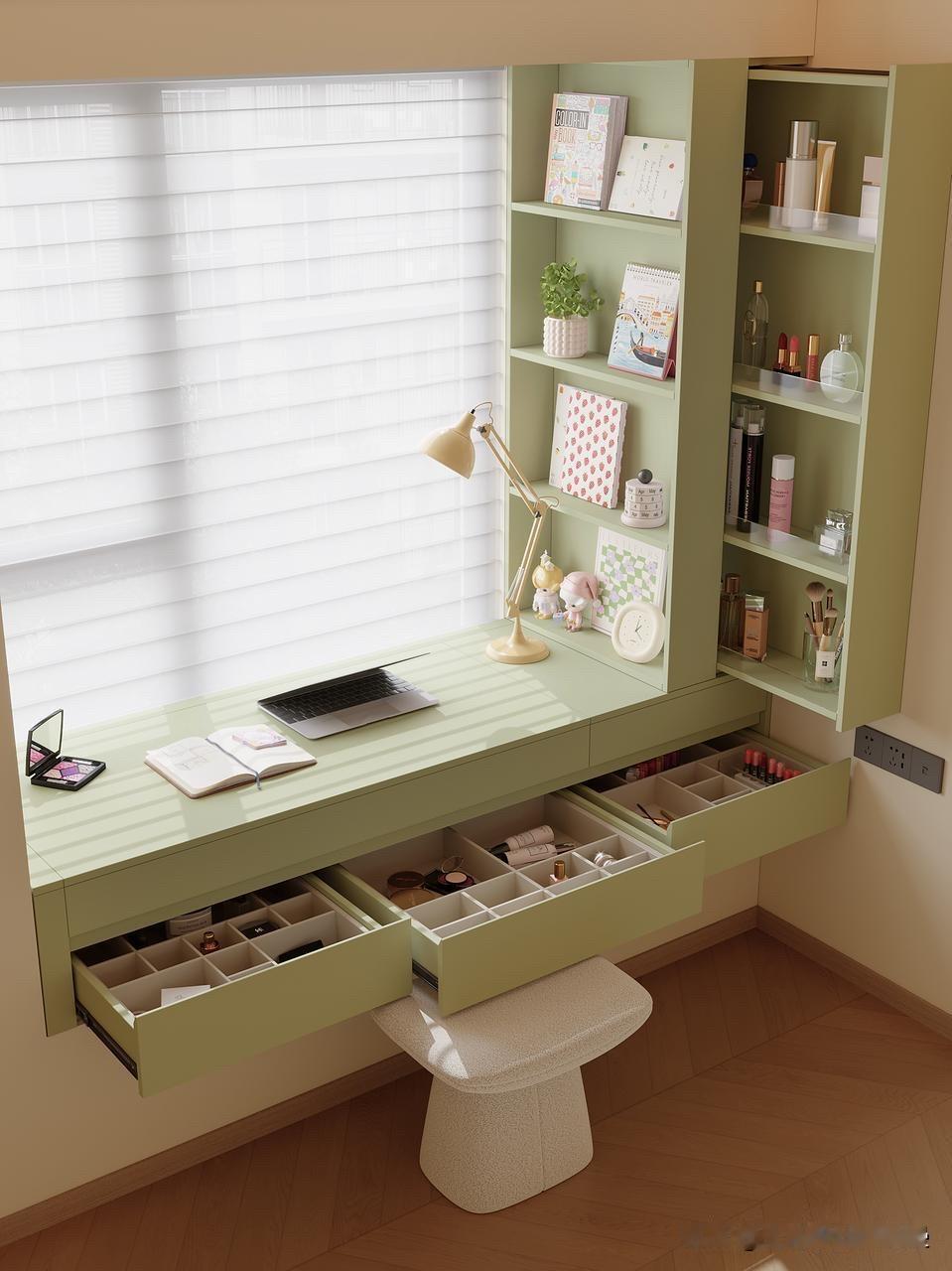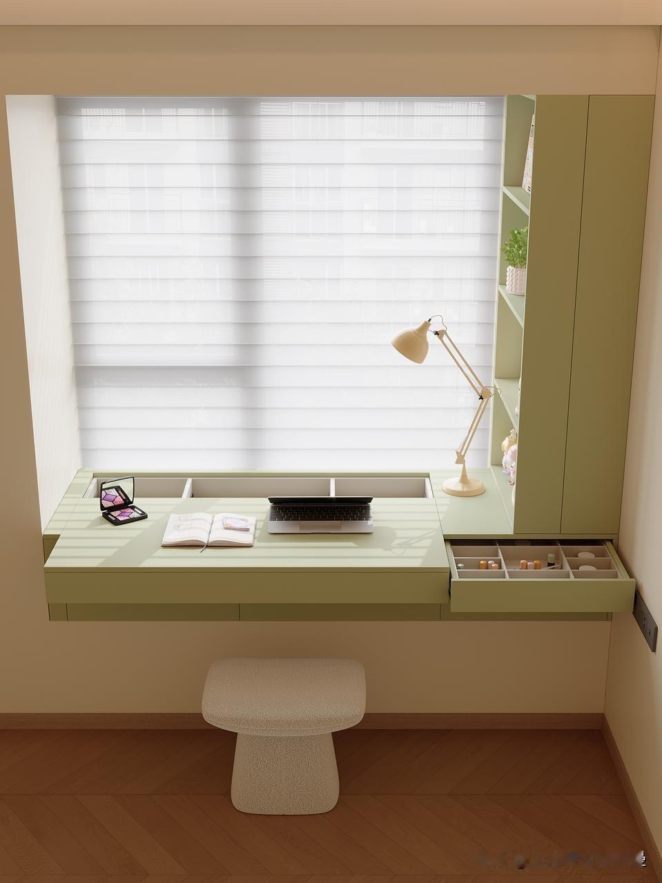 之前的飘窗就是个杂物堆放区,空着浪费、用着鸡肋。这次狠下心做了定制,把它改成了集办公、化妆、收纳于一体的多功能区,颜值和实用性直接拉满!
