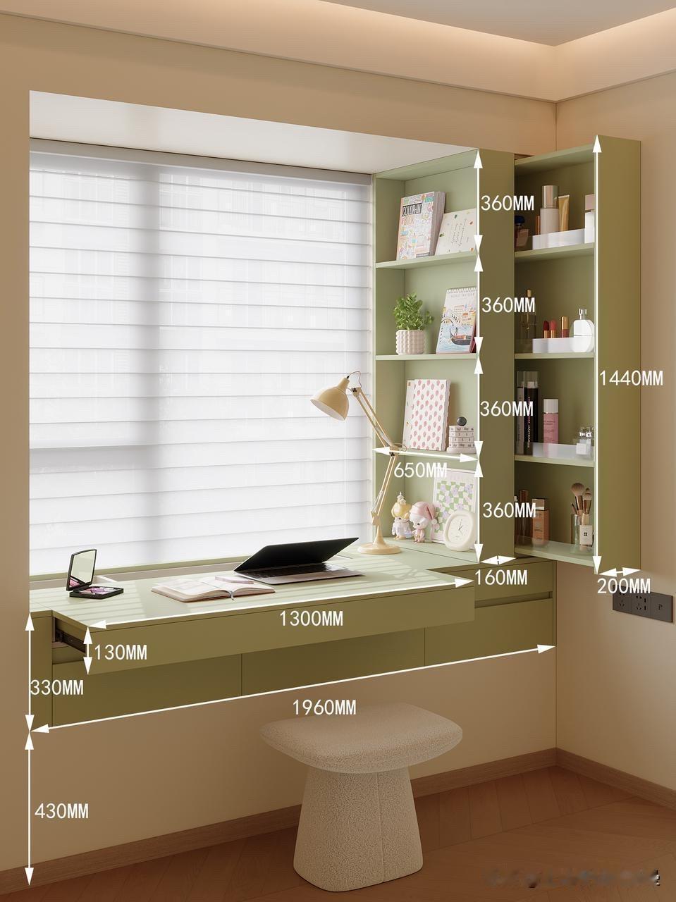 • 悬空书桌+抽屉收纳,化妆品、文具都能藏起来,台面永远清爽