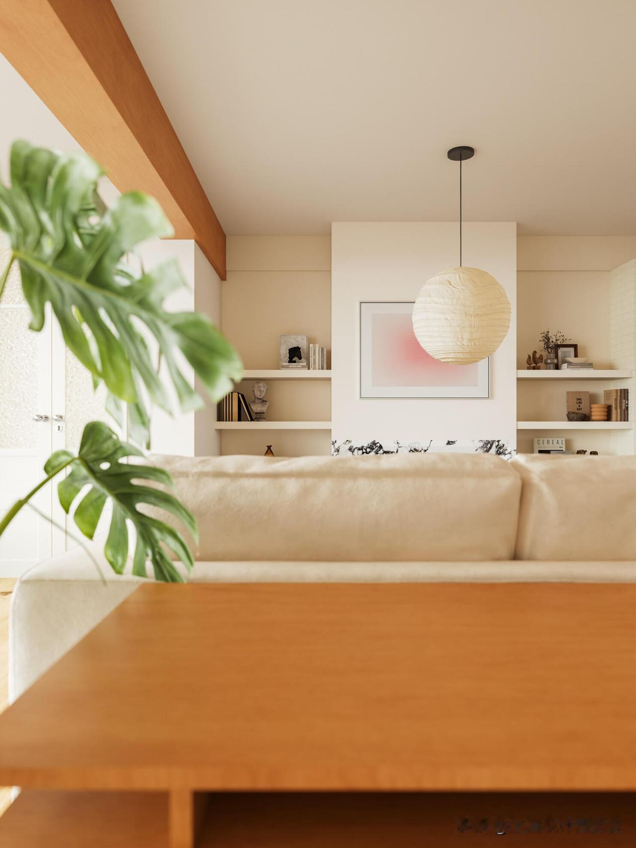 [三R]沙发居中的野口勇吊灯作为沙发区域的界定点,同时也是吊顶比例变化的延伸。