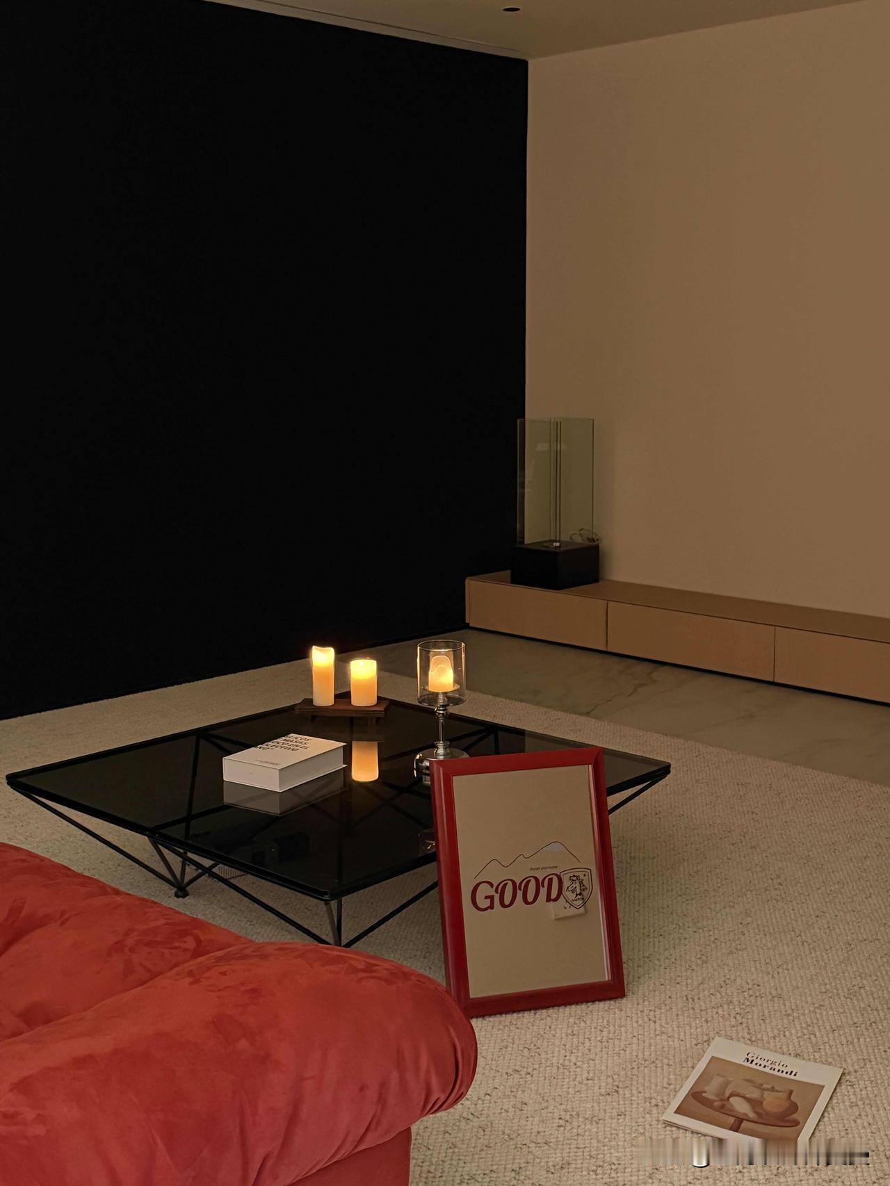 黑幕布+无主灯+极简地台,打造出专属的家庭影院,是属于业主的「独处充电区」,一盏香薰蜡烛,就能拥有一整晚的治愈。