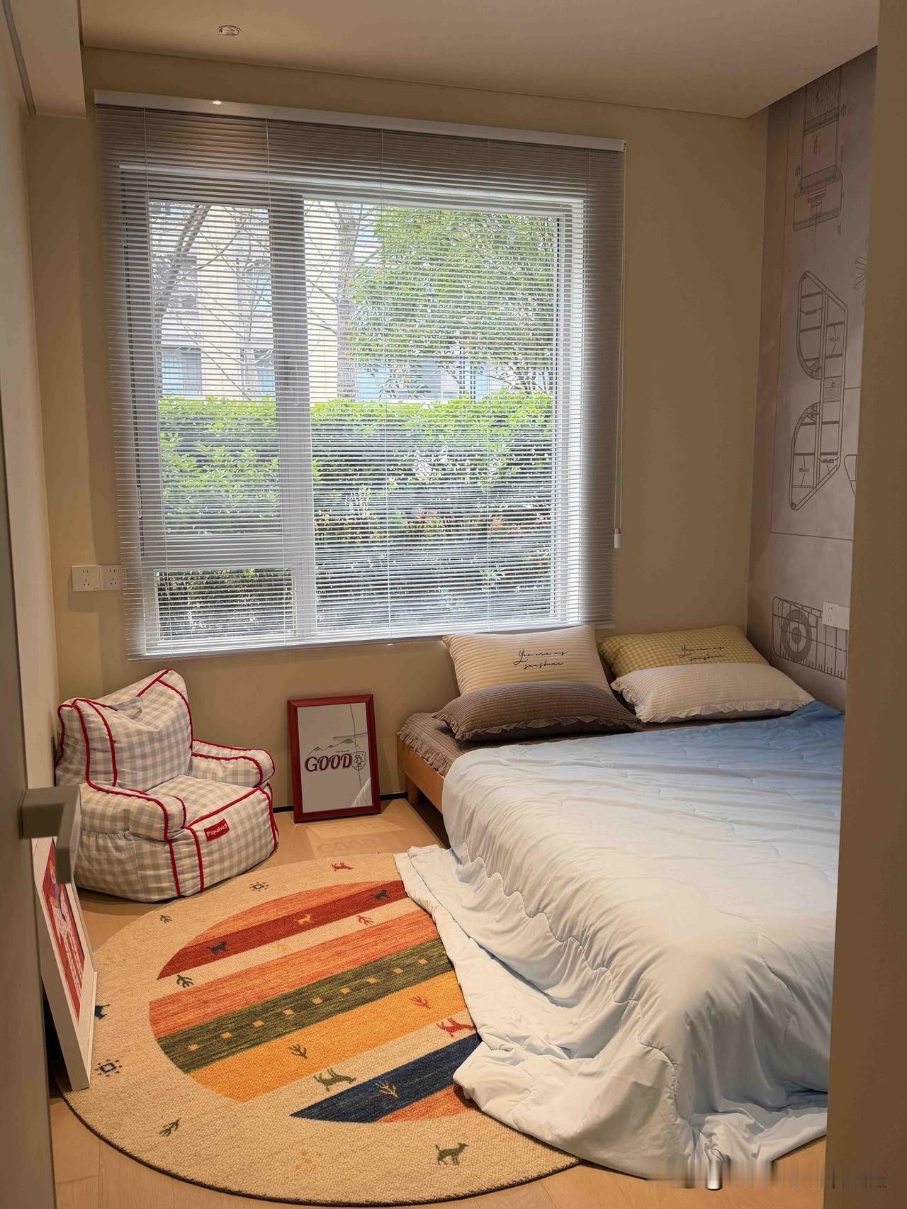 没有做过度的装饰,用可灵活调整的布局+治愈系软装,给孩子留足了成长的可能性。圆形地毯、格纹沙发,把童趣藏在细节里。