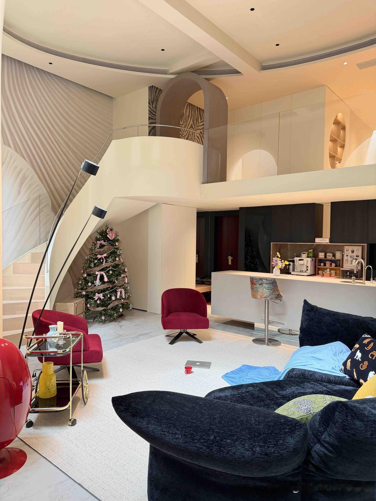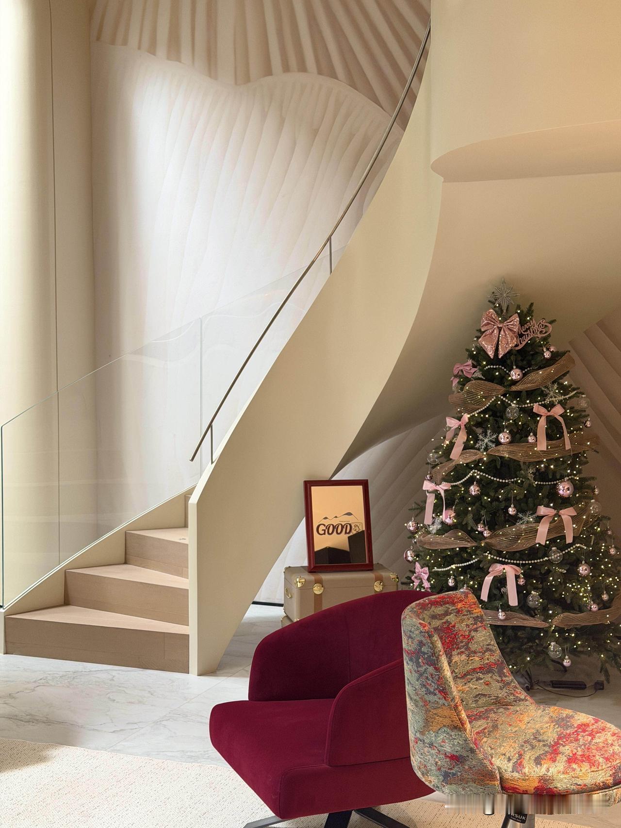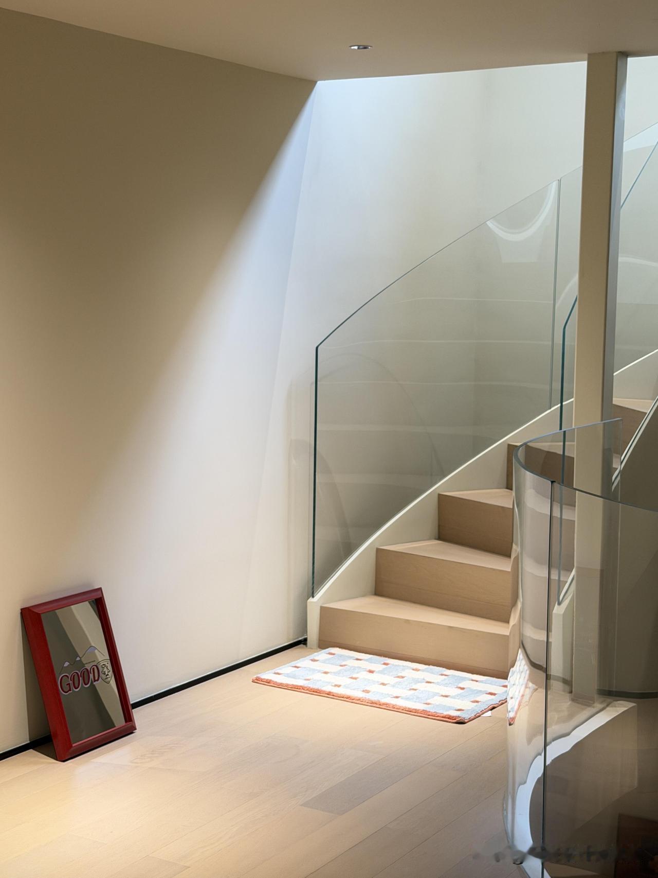 弧形旋转楼梯是整个空间的灵魂,奶白色的流线型结构搭配玻璃护栏,既弱化了楼梯的厚重感,又让上下层空间自然贯通。