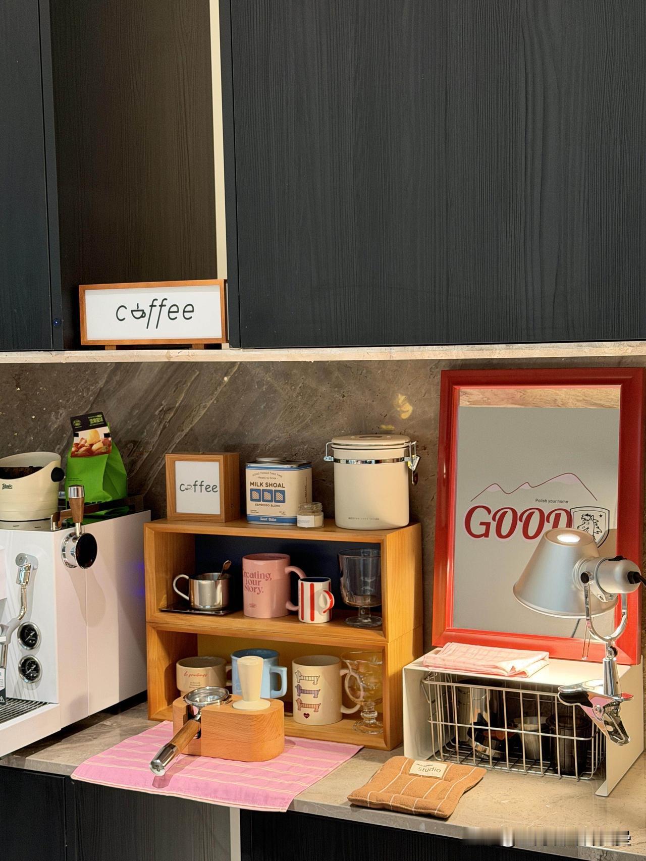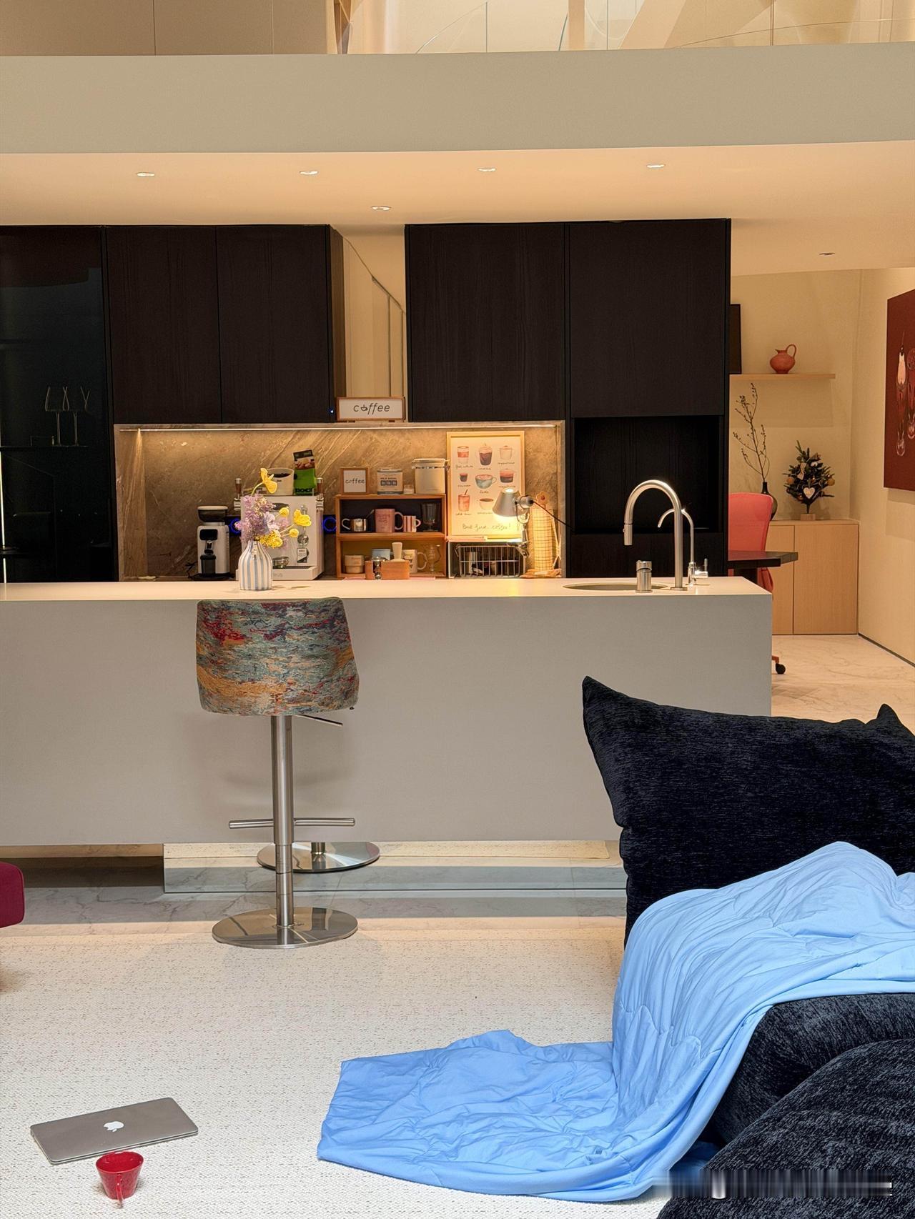开放式中岛咖啡区是我特意预留的「生活仪式感角落」,黑柜+暖石台面的碰撞,把日常的咖啡时光变成了治愈时刻。